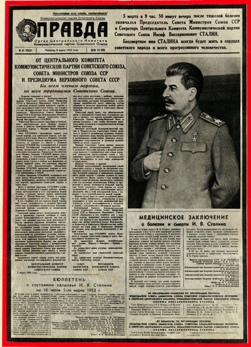5 марта 1953 года было объявлено о смерти Иосифа Виссарионовича Сталина... Н.С. Хрущев возглавляет комиссию по организации похорон И.В. Сталина. "Сталин ушёл не в прошлое, он растворился в нашем будущем, - как это не опечалит многих." Французский писатель Пьер Куртад МЕДИЦИНСКОЕ ЗАКЛЮЧЕНИЕ О БОЛЕЗНИ И СМЕРТИ И.В. СТАЛИНА В ночь на второе марта у И.В. Сталина произошло кровоизлияние в мозг (в его левое полушарие) на почве гипертонической болезни и атеросклероза. В результате этого наступили паралич правой половины тела и стойкая потеря сознания. В первый же день болезни были обнаружены признаки расстройства дыхания вследствие нарушения функции нервных центров. Эти нарушения изо дня в день нарастали; они имели характер т.н. периодического дыхания с длительными паузами (дыхание Чейн-Стокса). В ночь на третье марта нарушения дыхания стали приобретать временами угрожающий характер. С самого начала болезни были обнаружены также значительные изменения со стороны сердечно-сосудистой системы, а именно, высокое кровяное давление, учащение и нарушение ритма пульса (мерцательная аритмия) и расширение сердца. В связи с прогрессирующими расстройствами дыхания и кровообращения уже с третьего марта появились признаки кислородной недостаточности. С первого дня болезни повысилась температура и стал отмечаться высокий лейкоцитоз, что могло указывать на развитие воспалительных очагов в легких. В последний день болезни, при резком ухудшении общего состояния, стали наступать повторные приступы тяжелой острой сердечно-сосудистой недостаточности (коллапс). Электрокардиографическое исследование позволило установить острое нарушение кровообращения в венечных сосудах сердца с образованием очаговых поражений сердечной мышцы. Во вторую половину дня пятого марта состояние больного стало особенно быстро, ухудшаться: дыхание сделалось поверхностным и резко учащенным, частота пульса достигла 140-150 ударов в минуту, наполнение пульса упало. В 21 час 50 минут, при явлениях нарастающей сердечно-сосудистой и дыхательной недостаточности, И.В. Сталин скончался. ОТ ЦЕНТРАЛЬНОГО КОМИТЕТА КОММУНИСТИЧЕСКОЙ ПАРТИИ СОВЕТСКОГО СОЮЗА, СОВЕТА МИНИСТРОВ СОЮЗА ССР И ПРЕЗИДИУМА ВЕРХОВНОГО СОВЕТА СССР Ко всем членам партии, ко всем трудящимся Советского Союза Дорогие товарищи и друзья! Центральный Комитет Коммунистической партии Советского Союза, Совет Министров СССР и Президиум Верховного Совета СССР с чувством великой скорби извещают партию и всех трудящихся Советского Союза, что 5 марта в 9 час. 50 минут вечера после тяжелой болезни скончался Председатель Совета Министров Союза ССР и. Секретарь Центрального Комитета Коммунистической партии Советского Союза Иосиф Виссарионович СТАЛИН. Перестало биться сердце соратника и гениального продолжателя дела Ленина, мудрого вождя и учителя Коммунистической партии и советского народа - Иосифа Виссарионовича СТАЛИНА. Имя СТАЛИНА - бесконечно дорого для нашей партии, для советского народа, для трудящихся всего мира. Вместе с Лениным товарищ СТАЛИН создал могучую партию коммунистов, воспитал и закалил ее; вместе с Лениным товарищ СТАЛИН был вдохновителем и вождем Великой Октябрьской социалистической революции, основателем первого в мире социалистического государства. Продолжая бессмертное дело Ленина, товарищ СТАЛ