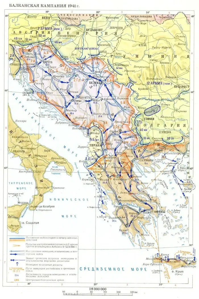 Цель — Балканы Пожар войны, который уничтожил несколько государств Западной Европы, не остановился у Ла-Манша, Атлантического океана и в Северной Африке. Обозначились новые направления большой войны. Готовясь к войне против СССР, Гитлер поставил своей целью укрепиться на Балканах. Он не хотел, чтобы британцы создали свой плацдарм на Балканах, вовлекая в свою орбиту Грецию и Югославию. Тем самым отрезая Германский рейх от Турции и её стратегического и экономического потенциала и оказывая влияние на другие балканские страны. Третий рейх последовательно наращивал свои возможности на Балканском полуострове и на северных, восточных границах Югославии. В 1938 году была ликвидирована независимость Австрии, сербы получили на севере плацдарм потенциального противника. Со стороны Италии угроза была на западном направлении: район Триеста и оккупированная итальянцами Албания. В сентябре 1940 года между Германией, Италией и Японией был заключен Тройственный пакт (Берлинский пакт). По нему Италия получала права на значительную часть Африки, Средиземноморье и Западные Балканы. Но итальянский дуче Муссолини, который мечтал о новой Римской империи, понимал, что Гитлер не будет его ждать. Немцы уже вошли в Румынию, которую дуче считал частью будущей империи. Нужно было закрепить свои права силой. Особенно манила Муссолини Греция. Рим решил провести «молниеносную войну» против Греции. В октябре 1940 года итальянцы вторглись в Грецию из Албании, захваченной в 1939 году. Гитлера дуче не предупредил. Хотя разведка у немцев работала хорошо, предупредила фюрера. Гитлер забеспокоился, что итальянцы наломают дров. Он поехал в Италию, чтобы охладить пыл союзника, но не успел. Война уже началась. Греки, неожиданно для итальянцев, оказали отчаянное сопротивление. Пограничные заставы итальянские дивизии легко смели, но дальше напоролись на упорную оборону греческой армии. Блицкрига не получилось. Мотивация греческих воинов, защищавших Родину, оказалась сильно выше, чем у итальянских солдат, которые не хотели воевать. Греки успешно ударили во фланг противника, перешли в контрнаступление, очистили от противника не только свою, но часть албанской территории. Британцы с помощью авианосца нанесли мощный удар по военно-морской базе в Таранто. Потопили новейший линкор «Кавур», ещё несколько кораблей повредили. В сущности, итальянский флот на время был парализован. Итальянцы перед угрозой военной катастрофы вынуждены были перебросить на Балканы новые большие подкрепления. Война затягивалась, и без помощи вермахта итальянцы не могли сломить оборону греческой армии, несмотря на серьёзное численное и техническое превосходство. Одновременно итальянцы провалили наступление армий в Северной и Восточной Африке, где они пытались выбить британцев из Египта и Судана. Наступление, после первых успехов (британцев там было мало), в итоге застопорилось, увязло, а затем британцы перешли в контрнаступление. Это была катастрофа. Фактически итальянская армия перестала существовать. В итоге, чтобы избежать полного поражения Италии и её возможного сепаратного мира с Британией, Гитлеру пришлось спасать союзника. В феврале 1941 г. в Северную Африку направлен германский корпус Роммеля. Также германское верховное командование готовит операции против Югославии и Греции. Англи