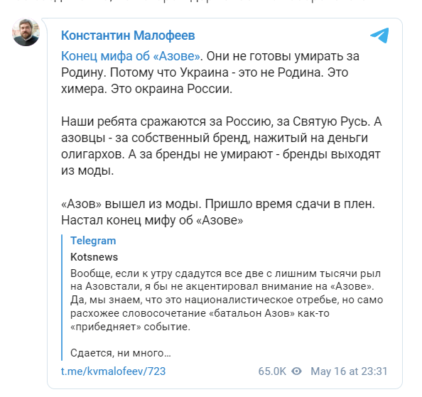 Конец мифа об "Азове"*, - обратил внимание в своём авторском Telegram-канале учредитель первого русского телеканала Царьград Константин Малофеев. - Они не готовы умирать за Родину. Потому что Украина - это не Родина. Это химера. Это окраина России. Константин Малофеев всего двумя фактами объяснил, в чём разница между русскими воинами и украинскими боевиками, развенчав "хероев Украины". Наши ребята сражаются за Россию, за Святую Русь, - пояснил он. - А "азовцы"* - за собственный бренд, нажитый на деньги олигархов. А за бренды не умирают - бренды выходят из моды. "Азов"* вышел из моды. Пришло время сдачи в плен. Настал конец мифу об "Азове"*. Ранее военкор "Комсомольской правды" Александр Коц в своём Telegram-канале отметил, что если к утру 17 мая сдадутся все две с лишним тысячи человек с "Азовстали", то он бы не стал акцентировать внимание именно на нацбатальоне "Азов"*. Сдаётся ни много ни мало весь Мариупольский гарнизон. Внушительная часть той военной массы, которая держала контроль над агломерацией с населением в полмиллиона человек, - пояснил свою мысль военкор. - Сдаётся с оружием и какой-то частью уцелевшей техники. А также с ценнейшими знаниями, наверняка с иностранными наёмниками и "родовой травмой" для всех ВСУ. Коц подчёркивает, что русские воины "психологически переломили не горстку нацистов (коими они, конечно, являются), а серьёзное, подготовленное, идеологически мотивированное соединение, на котором держалась вся оборона юга". * Украинский нацбатальон "Азов" – экстремистская организация, запрещенная на территории России. | |