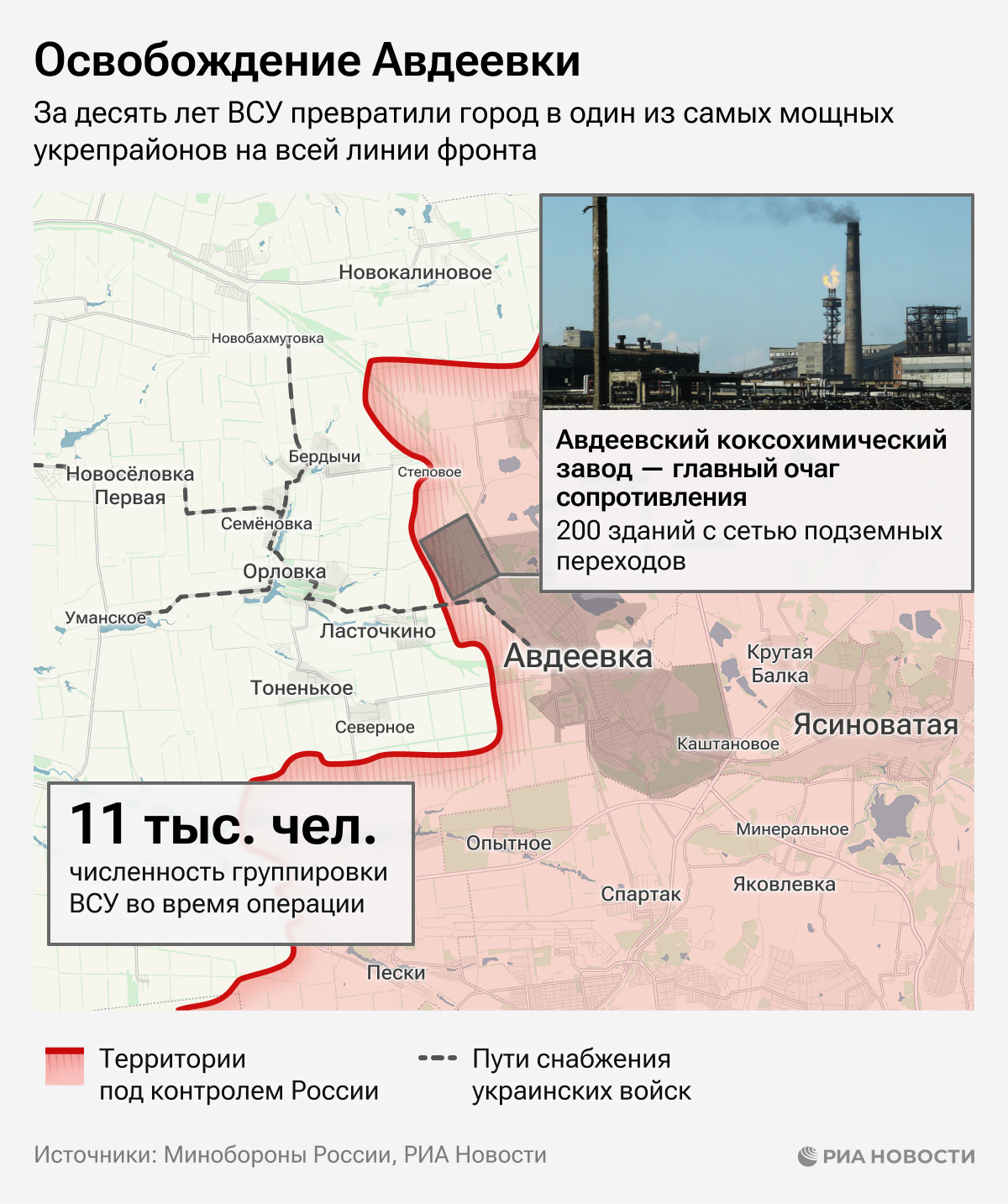 ТЕЛЕГРАММ замедляется.Вероятно скоро его заблокируют.Чтобы не потерять нас и получать оперативно информаци. подпишись на наши каналы в МАХ.Кто еще не подписался В полностью Российской сети МАХ на каналы ВОЕННЫЕ ПЕНСИОНЕРЫ : Канал для Военных пенсионеров без войны и политики:О Военных пенсиях,пенсиях жен военных пенсионеров ,жизни военных пенсионеров,о способах прожить дольше,события и новости в России : https://max.ru/voennyepen За Родину .Мы победим.: Оперативная информация О Спецоперации ,политике на канале: https://max.ru/join/aXh9SdoNhgk2rhy901ENolzCyoGLJhMgpon7E6np9n0 СРОЧНО ПОДПИСЫВАЙСЯ и ты будешь в курсе оперативных событий.НЕ пропусти!!! Российские войска заняли город. По сообщению Минобороны России, вооруженные силы освободили площадь более 31 квадратного километра. А ранее украинское командование заявило, что ВСУ покидают свои позиции. О том, как это повлияет на обстановку в зоне конфликта, — в материале Министр обороны Сергей Шойгу доложил сегодня об успехе Верховному главнокомандующему. Взятый под контроль населенный пункт, по сообщению ведомства, представлял собой "мощный оборонительный узел Вооруженных сил Украины". Освобождение Авдеевки "В настоящее время проводятся мероприятия по окончательной зачистке города от боевиков, блокированию украинских подразделений, оставивших город и засевших на Авдеевском коксохимическом комбинате", — говорится в пресс-релизе. Также там пояснили, что освобождение Авдеевки позволило отодвинуть линию фронта от Донецка, который долгое время обстреливали из этого города. А российские войска "продолжают наступательные действия по дальнейшему освобождению" ДНР. К середине февраля положение авдеевского гарнизона из тяжелого превратилось в критическое. Штурмовые подразделения российской армии практически замкнули кольцо окружения вокруг города, вплотную приблизившись к населенному пункту Ласточкино. Через него проходила последняя дорога на запад, по которой осуществлялось снабжение частей ВСУ. Одновременно украинских военных выдавили с ряда хорошо оборудованных позиций, в частности из укрепрайона "Зенит" южнее Авдеевки и из лесополосы северо-западнее. Группировка, по сути, оказалась разделена на две части. Первая пыталась вырваться из города. По отступающим разрозненным подразделениям немедленно наносили точные удары. Вторая часть гарнизона, костяк которой составляют бойцы 3-й отдельной штурмовой бригады, засела на территории Авдеевского коксохимического завода. Это элитное соединение украинской армии главком Сырский бросил на подмогу осажденному гарнизону. Однако штурмовики практически сразу же попали в окружение. Сейчас они скрываются в подвалах и бункерах предприятия и записывают видео с призывами их эвакуировать или деблокировать. Тем самым зеркально повторяется ситуация с "Азовсталью", где боевики "Азова"* несколько недель прятались под землей, пока в результате переговоров их оттуда не "эвакуировали" в российский плен. Как победили Одну из главных ролей в освобождении Авдеевки сыграла авиация. Фронтовые бомбардировщики Су-34 с самого начала операции 10 октября прошлого года в ежедневном режиме "обрабатывали" укрепрайон фугасными авиабомбами, оснащенными универсальными модулями планирования и коррекции. УМПК позволял самолетам наносить удары, не рискуя попасть под огонь вражеской ПВО. Мощи 50