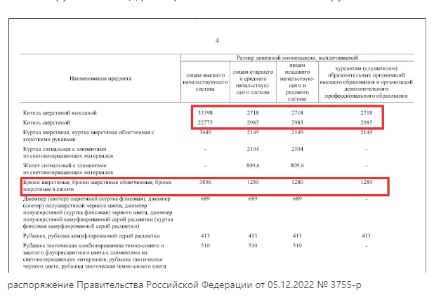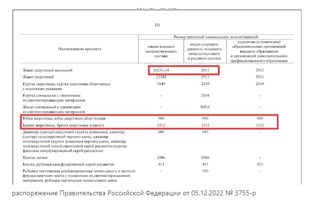 На официальном портале опубликования правовых актов появился документ, в котором содержится информация, проанализировав которую можно узнать во сколько МВД обходятся лампасы генералов. В распоряжении Правительства Российской Федерации от 05.12.2022 № 3755-р, установлены размеры денежной компенсации за неполученное вещевое обмундирование. распоряжение Правительства Российской Федерации от 05.12.2022 № 3755-р Исходя из таблицы видно, что компенсация за брюки для лиц, из числа высшего начальствующего состава, составляет 3856 рублей, тогда как для иных сотрудников МВД размер компенсации только 1280 рублей. распоряжение Правительства Российской Федерации от 05.12.2022 № 3755-р Если учесть, что брюки и тех и других практически идентичны по крою и материалу, то смею предположить, что тут дело в лампасах и компенсация за то, что их не получил аж 2570 рублей. Кроме того, из этой же таблицы видно, что присуствует десятикратная разница в компенсации за китель и куртку этим же категориям сострудников (33398 рублей против 2718). А вот для женщин-генералов никакой особой компенсации за лампасы не предусмотрено. распоряжение Правительства Российской Федерации от 05.12.2022 № 3755-р При этом также присуствует огромный разрыв в компенсации за жакет (26254 рубля против 2911). Получается, что на содержание больших полицейских начальников государство тратит в несколько раз больше, чем на обычного участкового, которому как раз и требуется нормальное и удобное обмундирование. Так может стоит оптимизировать количество начальствующего состава, раз на улицах, как заявляет министр работать некому, да и содержание начальников слишком дорого? Как думаете? | |