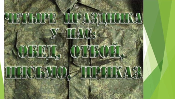 Эпизод VIII новогодней сказки с продолжением Часть праздничная, юмористическая, добрая, дембельская «День Приказа: прекрасное далёко, не будь ко мне жестоко...» Народное творчество Всех, кто служил, кто служит и кто будет служить – с Днем Приказа! Ко Дню Приказа мы начинали готовиться очень сильно заранее... Недели за 2–3 до 100 дней до приказа начальство собирало будущих дембелей и начинало выносить им мозг на тему «Ну вот не дай Бог вы побреетесь налысо! Ух... Мстя наша будет страшна»... Дальше было как в басне Крылова: «А Васька слушает да ест». Естественно, все брились наголо за 100 дней до Приказа, естественно, все получали люлей по полной схеме – но что поделаешь... Традиции – они такие традиции. Начинать готовить заранее, до 100 дней до Приказа, дембельский альбом, эполеты и аксельбанты считалось плохой приметой... Но вот как люли все получили – тут и начиналось таинство изготовления дембельских аксессуаров... Для людей, имеющих к этому отношение – это были два самых важных по денежному эквиваленту дохода в год, несмотря на то, что мы все сидели на хозрасчете... За один «дембельский аврал» можно было срубить бабок больше, чем за 2 года службы официально на свою сберкнижку! Досье на членов картеля по изготовлению дембельских аксессуаров моего призыва из моей части 1. Кузнец, он же Цыган, он же Рома, он же Ювелир, он же Фикса. Родился в доме в 10 метрах от кузни в Молдавии, из осевших цыган. Руки вечно в обожженных трудовых мозолях. Так получилось, что когда его призвали, дембель-кузнец уже уволился по аккорду, и месяц кузня пустовала. На следующий же день, как мы все отправились на «Курсы молодого бойца», его вместо курсов отправили на кузню сразу пахать. Кузня была забита всем необходимым, единственное, что он тогда впервые в жизни увидел – был механический гидравлический пресс, но за несколько дней «методом научного тыка» он разобрался с принципом работы. Отливал «фиксы» такого качества, что любой ювелир удавился бы от зависти. 2. Маляр – подпольная кличка Художник. Неоднократный победитель всяких там социалистических соревнований в своем ПТУ, где учился. Мог изобразить красками по железу всё, что угодно. Вечно разноцветный – даже после бани. 3. Жестянщик. Из трудовой династии жестянщиков. Когда жена зампотеха части на красный сигнал светофора на «шахе» въехала в зад ГАЗ-53, шестерка сложилась гармошкой. Он вытянул весь передок мафинки так, что не отличишь от нулёвой. Делать номера для машин для ВАИ – это было его прямой обязанностью. А также набивать циферки на всём, где должны были быть номера. По железу мог сделать всё, на что хватало фантазии у заказчиков. 4. Сварщик. Официально – газоэлектросварщик. В камере под аргоном мог припаять что угодно к чему угодно – даже если это в принципе было невозможно. Вечно слезящиеся глаза, вечно закапывает их жидкостью для глаз. 5. Швея-моторист – будете смеяться, но это официальное название, подпольное – Кожевник. С лет 7 «на ты» с кожами, иголками, нитками, тканями. Командиры, и наш, и дружественных нам частей, обшивали свои генеральские уазики, и не только, даже «чорный Волга», только у него. Вечно вонял всякими там кислотами и химикалиями, руки – вечно обожженные серной кислотой или чем-то там еще. 6. Токарь-фрезеровщик, подпольная кликуха «Хохол» – родился и вырос в Киеве. Любую деталь, которую ну хотя бы теорет