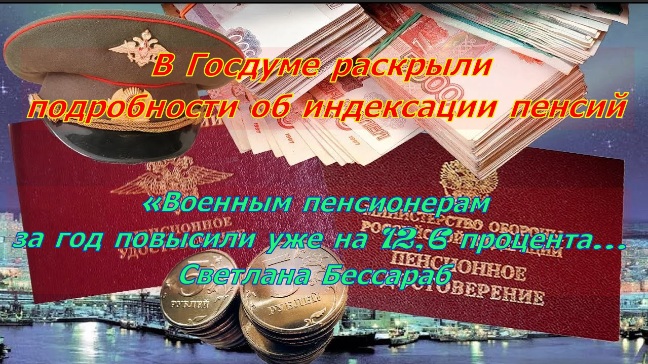 «Военным пенсионерам за год повысили уже на 12,6 процента... Светлана Бессараб Член комитета Госдумы по труду, социальной политике и делам ветеранов Светлана Бессараб рассказала о предстоящей индексации выплат для пенсионеров