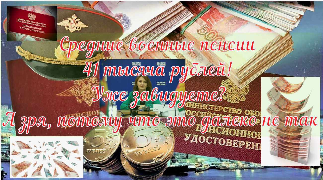 Тут недавно наткнулся на информацию о том, что военные пенсии составляют в среднем 41 000 рублей. Об этом сообщила в начале мая член комитета Госдумы по труду Светлана Бессараб.