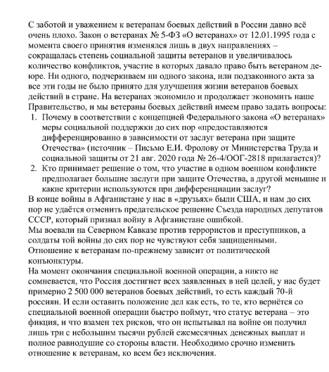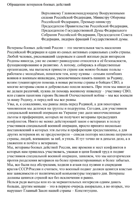 ТЕЛЕГРАММ замедляется.Вероятно скоро его заблокируют.Чтобы не потерять нас и получать оперативно информаци. подпишись на наши каналы в МАХ.Кто еще не подписался В полностью Российской сети МАХ на каналы ВОЕННЫЕ ПЕНСИОНЕРЫ ЗА РОССИЮ И ЕЕ ВООРУЖЕННЫЕ СИЛЫ: Канал для Военных пенсионерах без войны и политики, Военных пенсиях,пенсиях жен военных пенсионеров ,жизни военных пенсионеров и о способах прожить дольше : https://max.ru/voennyepen За Родину .Мы победим.: Оперативная информация О Спецоперации ,политике на канале: https://max.ru/join/aXh9SdoNhgk2rhy901ENolzCyoGLJhMgpon7E6np9n0 СРОЧНО ПОДПИСЫВАЙСЯ и ты будешь в курсе оперативных событий.НЕ пропусти!!! В начале этого года и месяца Президент подписал указ о дополнительных социальных гарантиях для военных. В частности, о выплатах для военнослужащих, получивших ранения. Они будут получать по три миллиона рублей. Семьи погибших бойцов получат пять миллионов рублей. А самое главное - при назначении пенсий нынешним участникам войны в соседней "братской" стране будет засчитываться один день службы за два. Подробнее ознакомиться с информацией можно по этой синей ссылке. Это новым ветеранам боевых действий. А старые, уже отработанные ветераны, ничего подобного не имеют и иметь, по всей видимости, не будут. Продекларированные когда-то "день за три" уже давно не действуют. Некоторые ветераны пишут по этому поводу, что ценой неимоверных усилий и продолжительных судилищ, удается эту льготу продавить. Не знаю, насколько это правда. Если есть у кого такой опыт - просьба поделиться. Мы уже не раз говорили о проблеме попыток разделения ветеранов на сорта. И эти опасения не на пустом месте. И вышеуказанный указ - лишнее тому подтверждение. Как-то не очень красиво выглядит ситуация, когда, чем свежее ветеран, тем выше его "проба". Такого быть не должно. Человек, проявивший мужество с оружием в руках, рискуя жизнью и здоровьем, встать на защиту интересов своей Родины, должен быть одинаково признан и почитаем государством, независимо от времени и места участия в боевых действиях. Ветеранское сообщество возмущено попытками разделения участников боевых действий на категории и сорта. По этому поводу готовится обращение во все властные структуры. Дискриминации ветеранов быть не должно. У одних забрали "один к трем", другим дали "один к двум". Ни два, ни полтора, что называется. Полагаем, что статус ветеран боевых действий должен быть един и меры социальной защиты тоже. Или всем, или никому, если уж на то пошло. Ориентировочно, обращение будет подготовлено к 20 января. Если у кого-то есть предложения и замечания, просьба высказывать. Только в конструктивной форме и по существу. Надеюсь, они будут учтены. Текст обращения готов Проанонсированное обращение ветеранов боевых действий по поводу разделения последних по сортам и категориям готово для применения в работе. Главная мысль обращения состоит в том, что разделение ветеранов боевых действий на категории по принципу времени и места конфликтов, в которых им довелось участвовать, в зависимости от политической конъюнктуры текущего дня, недопустимо. Если вы даете человеку статус ветерана боевых действий, значит вы признаете его заслуги независимо от вышеуказанных, очень субъективных обстоятельств. Иначе, признание более свежих ветеранов более ветеранистыми, нежели те, что стали ветеранами ранее, мо