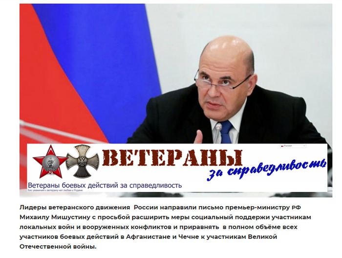 На обращение генералов 17.01.2021 Лидеры трёх ведущих ветеранских организаций написали премьеру письмо с просьбой «дать поручение Правительству Российской Федерации рассмотреть, наконец, вопрос и приравнять в полном объёме всех участников боевых действий в Афганистане и Чечне — прежде всего, к участникам Великой Отечественной войны!» Трогает, без всякого ёрничания, слог письма, премьер-министра не просят, а обращаются с Великой просьбой. Слог старый, можно сказать дореволюционный, но тем не менее весьма душевный. Да и сами люди к премьеру обратившиеся легенды Русской армии, Громов, Шаманов, Востротин – это не фамилии или имена, это явления русской военной жизни, а в последствии уверен и истории. Четвертый подписант полковник Саблин Дмитрий Вадимович, депутат Государственной думы многих созывов, член партии «Единая Россия» тоже личность в ветеранском движении России известная. Текст письма: Председателю Правительства Российской Федерации Михаилу Владимировичу Мишустину Многоуважаемый Михаил Владимирович! Мы, представители ветеранов всей нашей страны обращаемся к Вам от имени нескольких сотен тысяч людей, прошедших в разные годы жестокие и кровопролитные локальные войны и различные военные конфликты (Афганистан, Чечня), на которые их направляло государство и где эти люди показали себя с самой лучшей стороны, продемонстрировав в тяжелейших условиях, связанных с постоянным риском для жизни, верность Присяге и своей Родине и настоящие образцы героизма, мужества, отваги и огромного терпения. Многие военнослужащие там погибли, были ранены и искалечены. Мы были свидетелями этого. Но их железный дух и готовность полностью выполнить поставленную задачу исходили из примеров наших отцов и дедов, воевавших с фашизмом в ходе Великой Отечественной войны. И все основные оперативные и стратегические задачи этими молодыми людьми были выполнены полностью. Прошло время и теперь они, наследники участников Великой Отечественной войны вышли в первые ряды ветеранов, вместо почти ушедших из жизни наших славных фронтовиков, сохранив и сейчас, в мирное время любовь к Родине, стойкость, желание и умение работать с молодежью по её патриотическому воспитанию. Что правда – так это то, что они никогда не предадут свою Родину, свою Россию! Прошло много времени после боевой поры, а льготы, которые тогда были определены и назначены им, как участникам боевых действий по защите интересов своей страны, давно потеряли своё значение и практически обесценились. Великая просьба к Вам – дать поручение Правительству Российской Федерации рассмотреть, наконец, вопрос и приравнять в полном объёме всех участников боевых действий в Афганистане и Чечне — прежде всего, к участникам Великой Отечественной войны! Время бежит и многие из них подошли по возрасту к 60 – 70 – 75 летнему рубежу, многие ушли из жизни в мирное время, многие имеют тяжелые хронические болезни и реально потеряли своё здоровье за Родину! Но они работают и с молодёжью, и с другими категориями наших граждан, передавая свой опыт, любовь к Родине, что очень важно, и железный характер. Но им очень тяжело жить материально! Уважаемый Михаил Владимирович! Пожалуйста услышьте нас и помогите кардинально решить вопросы помощи ветеранам боевых действий! С уважением, Генерал – полковник Громов Б.В. – команд