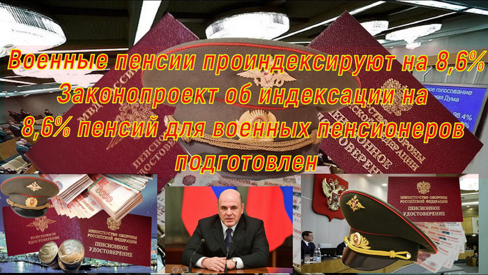 Законопроект об индексации на 8,6% пенсий для военных пенсионеров подготовлен, она будет отсчитываться с 1 января 2022 года, сообщил премьер-министр РФ Михаил Мишустин на заседании правительства в четверг. "Подготовлен законопроект об индексации пенсий на 8,6%. Такую ежемесячную доплату получат военные пенсионеры и приравненные к ним лица, в том числе служившие в органах внутренних дел, национальной гвардии, и пожарные", - сказал глава кабмина. Он подчеркнул, что "надбавка будет начислена с 1 января текущего года". Мишустин попросил депутатов рассмотреть законопроект в кратчайшие сроки, чтобы люди получали повышенные пенсии своевременно и в полном объеме. | |