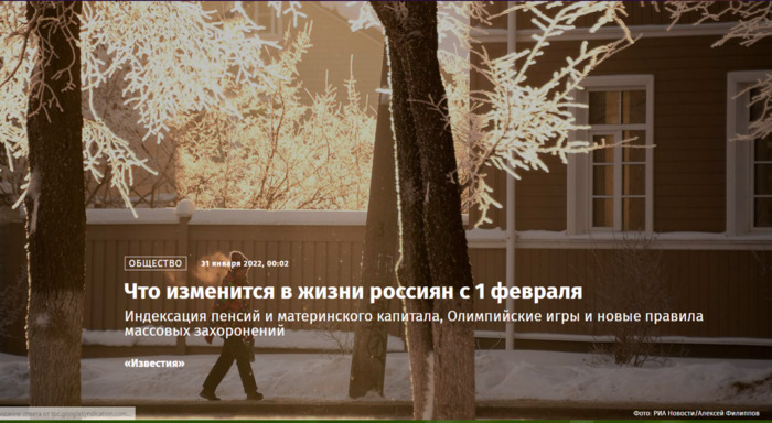 Индексация пенсий и материнского капитала, Олимпийские игры и новые правила массовых захоронений «Известия» Фото: РИА Новости/Алексей Филиппов В феврале материнский капитал и ряд других социальных выплат проиндексируют с учетом фактической, а не прогнозируемой инфляции — это значит, что выплаты должны вырасти на 8,4%. Кроме того, неработающих пенсионеров ждет дополнительная индексация пенсий с январских 5,9 до 8,6%. За должниками закрепят «неприкосновенный минимум» доходов, а владельцы банковских вкладов размером более миллиона рублей впервые должны будут заплатить налог. Подробнее об этих и других нововведениях — в традиционном обзоре «Известий». Индексация материнского капитала В феврале ожидается индексация ряда пособий. Так, материнский капитал в этом году будет проиндексирован в начале февраля исходя из уровня фактической инфляции. До этого года маткапитал традиционно индексировался в январе по уровню прогнозируемой инфляции. Закон о переходе на новый формат, который теперь должен использоваться ежегодно, в декабре прошлого года подписал Владимир Путин. В середине января Минтруд сообщил, что в этом году материнский капитал с учетом фактической инфляции проиндексируют на 8,4%. коляска Фото: ИЗВЕСТИЯ/Александр Полегенько Таким образом, выплата на первого ребенка составит 524,5 тыс. рублей и 693,1 тыс. рублей — на второго при условии, что семья не получала денег после рождения первого. Если выплата ранее была получена, за второго ребенка семье выплатят 168,6 тыс. рублей. Напомним, что в 2021 году размер материнского капитала составлял 483,8 тыс. рублей на первого ребенка и 639,4 тыс. рублей на второго (если выплата получена впервые). …И других выплат Вырастут на 8,4% и другие социальные пособия. Так, единовременная выплата при рождении ребенка (получить ее можно вне зависимости от трудоустройства и уровня доходов родителей) составит 18,8 тыс. рублей в случае, если ребенок родился до начала февраля, и 20,4 тыс. рублей — если ребенок родился после 1 февраля. Обратиться за выплатой можно в течение полугода с момента рождения ребенка. Минимальное пособие по уходу за ребенком в возрасте до полутора лет составит 7,6 тыс. рублей в месяц, максимальная планка вырастет до 31,3 тыс. рублей (сейчас — 7 тыс. и 29,6 тыс. рублей соответственно). Если пособие уже было назначено ранее, дополнительно обращаться за перерасчетом не потребуется. Единовременное пособие, которое выплачивается опекунам или усыновителям при передаче детей в семью, составит 20,4 тыс. рублей, а максимальное — 156,4 тыс. рублей. Всё это в случае, если ребенок будет передан после 1 февраля. Также проиндексированы будут и некоторые другие социальные выплаты, в том числе пособие на погребение (составит 6,9 тыс. рублей), пособия тем, кто получил инвалидность из-за чернобыльской аварии, и ликвидаторам (3,1 тыс. рублей ежемесячно), героям и полным кавалерам ордена Славы (74,6 тыс. рублей ежемесячно). Ежемесячная выплата участникам ВОВ составит 4,7 тыс. рублей. Прибавка к пенсиям для неработающих пенсионеров Неработающие пенсионеры в феврале могут ожидать дополнительную индексацию пенсии. Напомним, в январе ее проиндексировали на 5,9%, однако вскоре после новогодних праздников Владимир Путин предложил проиндексировать ее выше уровня фактической инфляции, которая оказалась в прошедшем году выше, чем планиров