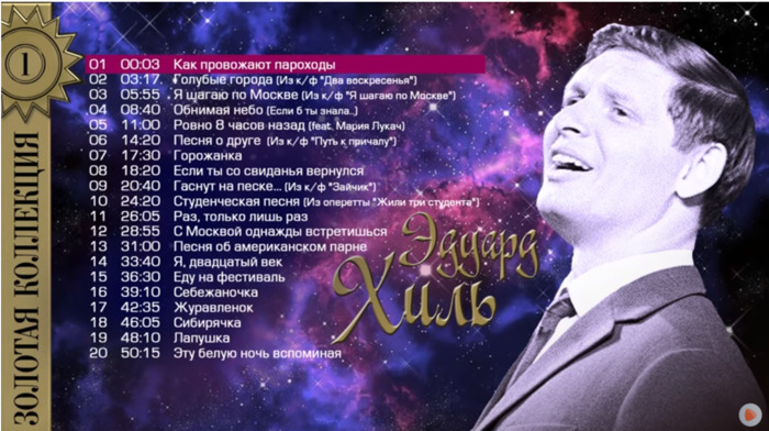 Трек-лист альбома "Эдуард Хиль - Золотая коллекция. Лучшие песни. ": 01 00:03 Как провожают пароходы 02 03:17 Голубые города (Из к/ф "Два воскресенья") 03 05:55 Я шагаю по Москве (Из к/ф "Я шагаю по Москве") 04 08:40 Обнимая небо (Если б ты знала..) 05 11:00 Ровно 8 часов назад (feat. Мария Лукач) 06 14:20 Песня о друге (Из к/ф "Путь к причалу") 07 17:30 Горожанка 08 18:20 Если ты со свиданья вернулся 09 20:40 Гаснут на песке… (Из к/ф "Зайчик") 10 24:20 Студенческая песня (Из оперетты "Жили три студента") 11 26:05 Раз, только лишь раз 12 28:55 С Москвой однажды встретишься 13 31:00 Песня об американском парне 14 33:40 Я, двадцатый век 15 36:30 Еду на фестиваль 16 39:10 Себежаночка 17 42:35 Журавленок 18 46:05 Сибирячка 19 48:10 Лапушка 20 50:15 Эту белую ночь вспоминая | |