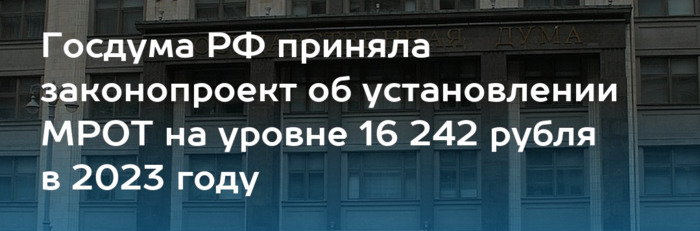 Депутаты Государственной Думы РФ 7 декабря в третьем чтении проголосовали за законопроект о повышении минимального размера оплаты труда. Как сообщает пресс-служба нижней палаты парламента, с нового года МРОТ вырастет на 6,3% и составит 16 242 рубля в месяц. Кроме того, в 2023 и 2024 году МРОТ будет повышаться в ускоренном порядке: его увеличение будет зависеть от темпов роста прожиточного минимума трудоспособного населения в целом по РФ и превысит их на три процентных пункта. | |
