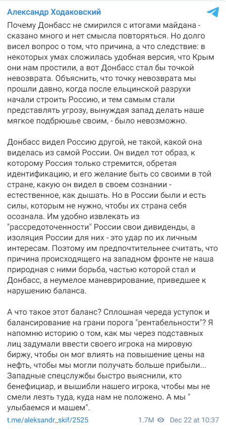 Донбасс и много лет тому назад - сразу после Майдана на Украине, - и теперь видит Россию другой. Тогда жители Донбасса не согласились с итогами Майдана, не захотели быть марионетками в руках киевского режима. Однако в России тот факт, что точка невозврата пройдена, поняли не сразу. Думали, что Крым так называемый коллективный Запад ещё готов простить, а вот Донбасс не простит, потому и не стали принимать главное решение, считает Ходаковский. Объяснить, что точку невозврата мы прошли давно, когда после ельцинской разрухи начали строить Россию и тем самым стали представлять угрозу, вынуждая Запад делать наше мягкое подбрюшье своим, было невозможно, - пишет комбат в личном телеграм-канале. При этом Донбасс верит, что Россия может стать сильнее. Донбасс видит образ России, который она обретает только теперь, признавая свою идентификацию, считает Ходаковский. Потому и желание быть в составе России для Донбасса совершенно естественно - это всё равно что необходимость дышать. Но в России были и есть силы, которым не нужно, чтобы их страна себя осознала. Им удобно извлекать из "рассредоточенности" России свои дивиденды, а изоляция России для них - это удар по их личным интересам, - высказался комбат о предателях, не таясь. В результате западные спецслужбы научились влиять на ситуацию в России через своих бенефициаров - предателей внутри страны. ![]() | |