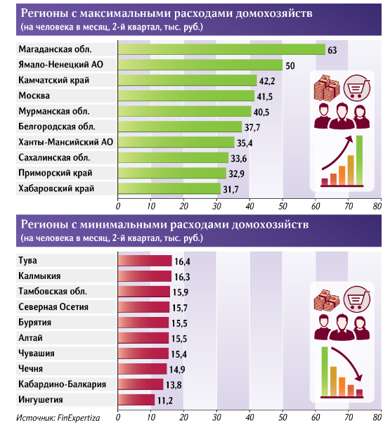 Мария Строителева Расходы российских семей выросли впервые после введения санкций. Во II квартале в реальном выражении (то есть с учетом инфляции) они поднялись на 7%, до 24,9 тыс. на человека. Это в среднем по стране, при этом где-то они составили 63 тыс., как в Магаданской области, а где-то, наоборот, просели — например, в Липецкой, до 20,7 тыс., говорится в исследовании FinExpertiza. Эксперты объясняют: потребление восстанавливается благодаря увеличению зарплат и уходу от сберегательной модели поведения. Власти могут расценивать такую динамику как положительную. К тому же ранее в Минэке говорили, что внутренний спрос станет основным источником роста экономики в ближайшие годы. Правда, риски чрезмерного ускорения инфляции от слишком активных трат тоже повышаются. В каких регионах расходы российских семей растут быстрее всего Потребление российских семей начало восстанавливаться впервые со II квартала 2022 года, говорится в исследовании FinExpertiza на основе данных Росстата (есть у «Известий»). Тогда, после введения антироссийских санкций, расходы домохозяйств стали сокращаться. Ограничения стали появляться с конца февраля, а в квартальных показателях отразились лишь в отчетах за апрель–июнь. Как отмечается в исследовании, траты семей снижались из-за разгона инфляции и перехода населения к сберегательной модели в условиях общей неопределенности. «Во II квартале 2022-го расходы в реальном выражении уменьшились на 5% год к году, в третьем — на 4%, в четвертом — на 0,7%. В I квартале 2023 года отрицательная динамика сохранилась, и траты сократились на 3,1%. Однако во II квартале нисходящий тренд прекратился», — приводят данные аналитики. Расходы семей с апреля по июнь 2023-го (самые актуальные данные) увеличились в реальном выражении на 7% (до 24,9 тыс. рублей в месяц в среднем на человека), подсчитали эксперты. В сопоставимых ценах с учетом инфляции это на 2% выше, чем во II квартале досанкционного 2021 года, когда потребление бурно росло на фоне восстановления экономики и снятия ковидных ограничений. Наибольший рост расходов семей зафиксирован в Белгородской (+67,5%, до 37,7 тыс. рублей) и Магаданской (+55,8%, до 63 тыс.) областях, а также в Ямало-Ненецком автономном округе (+32,4%, до 50 тыс.). Сократили потребление домохозяйства в 10 регионах страны. Сильнее всего — в Санкт-Петербурге: на 35,5%, до 30,6 тыс. рублей на человека в месяц. В Липецкой области траты уменьшились на 12,2%, до 20,7 тыс., в Курской — на 10,8%, до 20,2 тыс., а в Амурской области — на 10%, до 21,6 тыс. рублей. В целом в структуре потребления снизилась доля трат на питание (до 37%). Зато выросли расходы на услуги и непродовольственные товары (до 28 и 33% соответственно). В оставшиеся 2% входят покупки алкоголя и льготные услуги от работодателей. Почему растут расходы российских семей Всплеску потребления во II квартале поспособствовало повышение доходов населения, а также реализация отложенного спроса и отказ от сберегательной модели поведения, считает президент FinExpertiza Елена Трубникова. — Кроме того, важным фактором стал рост кредитования в связи с низкими процентными ставками в первой половине года. Россияне во многом адаптировались к сегодняшней экономической реальности. В конечном итоге расширение спроса стало превышать предложение товаров и услуг, что стимулировало повышение уже нормализовавшейся инфляции, — отметила она. Нынешня
