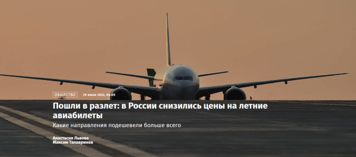 Анастасия Львова Максим Талавринов В России подешевели перелеты по стране. Речь идет о рейсах с вылетом в III квартале этого года — средние цены на них снизились на 3–4%, сообщили «Известиям» в сервисах по поиску и бронированию Onetwotrip и «Туту.ру». У «Аэрофлота» стоимость билетов этим летом опустилась еще ниже — на 20% по сравнению с 2021-м, сказал «Известиям» источник, близкий к группе. Это происходит из-за многочисленных распродаж авиакомпаний, которые пытаются выполнить поручение президента РФ и перевезти не менее 100 млн пассажиров за 2022 год. Также на цены влияют рекордные объемы выставленных в России провозных емкостей. Самым топовым направлением лета внутри страны, помимо столицы, стал Сочи — пока единственный открытый аэропорт Краснодарского края. Туда оформляется каждый пятый перелет. Из зарубежных маршрутов верхнюю планку держит Турция — несмотря на то что авиабилеты в страну подорожали на 80–120%. Эксперты предупреждают: такой ценовой тренд — не самый хороший сигнал для рынка. Летние распродажи По данным Onetwotrip, средняя стоимость авиабилета по России с вылетом в III квартале составляет 7,2 тыс. рублей за перелет в одну сторону в экономклассе против 7,5 тыс. рублей в 2021 году и 7,8 тыс. рублей в 2019-м. — Авиакомпании стараются поддерживать спрос со стороны туристов на полёты по стране, и цена, соответственно, снижается, — пояснила «Известиям» руководитель пресс-службы Onetwotrip Елена Шелехова. По данным Туту.ру, средний чек за перелет на 3% меньше, чем в 2021 году, и составляет 8730 рублей в одну сторону против 8971 рубля в прошлом году. При этом отдельные направления подешевели еще сильнее: перелет по направлению Москва – Санкт-Петербург — на 16%, Москва – Самара — на 37%, Москва – Архангельск и Москва – Анадырь — на 32–33%. Больше всего снизились средние чеки по направлениям Ленск (Республика Саха) – Иркутск (–47%) и Южно-Сахалинск – Благовещенск (–46%). Понижательный ценовой тренд зафиксировал и Росстат, который считает стоимость перелета только в экономклассе и только на 1 тыс. км пути. По данным ведомства, в мае цены снизились на 5,5% к апрелю, при этом остаются почти на 2% выше, чем годом ранее (5447,73 рубля). Авиакомпании, стремясь выполнить поручение президента РФ Владимира Путина и перевезти не менее 100 млн пассажиров в этом году, устраивали многочисленные распродажи прямо в разгар высокого летнего сезона. Так, «Аэрофлот» весной объявил недельную распродажу на рейсы по России (скидки достигали 50% на рейсы по 79 направлениям с вылетом до конца октября). Билеты на них можно было купить начиная с 1,5 тыс. рублей в одну и 2,5 тыс. рублей в обе стороны. В июне авиагруппа анонсировала еще одну распродажу со скидками до 60%. В тот же месяц давать скидки начала и «Победа» (входит в группу «Аэрофлот»), а в мае — S7 Airlines (доходили до 60%). «Уральские авиалинии» и Red Wings объявляли распродажу билетов для детей от 2 до 12 лет (50% и 40% от тарифа соответственно). За пять месяцев 2022 года российским авиакомпаниям удалось перевезти 31,6 млн пассажиров, что на 4,2% ниже аналогичного периода прошлого года, — по данным российской Ассоциации эксплуатантов воздушного транспорта (АЭВТ). Росавиация перестала публиковать официальную статистику по пассажиропотоку в марте. При этом на «международке» было перевезено примерно 6 млн пассажиров, на внутренних рейсах — 25,5 млн (–11,2% к 2021 году). По предварите