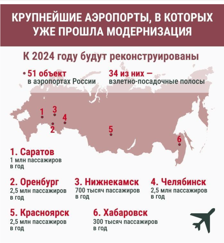 В 2021 году российские аэропорты обслужили почти 205 млн пассажиров — это на 58% больше, чем годом ранее. По данным Росавиации, подавляющее большинство из них — 85% — летали именно внутренними рейсами. Чтобы эти перелеты стали более комфортными и безопасными, чтобы развивался и становился доступнее внутренний туризм, с 2019 года по национальному проекту «Комплексный план модернизации и расширения магистральной инфраструктуры» действует федеральный проект «Развитие региональных аэропортов». К 2024 году в России введут 51 важный объект аэродромной инфраструктуры Качественный скачок Модернизация региональных аэропортов активизировалась в последнее десятилетие: начиная с 2012 и по 2017 год Федеральное агентство воздушного транспорта (Росавиация) провело большую работу в части развития аэродромных комплексов. В частности, было построено два новых аэропорта, реконструированы 24 взлетно-посадочные полосы. Однако для качественного скачка в развитии пассажирских авиаперелетов внутри страны нужна была специальная программа. Ее основы были заложены после послания президента Владимира Путина Федеральному Собранию в 2018 году. Тогда глава государства дал четко понять: откладывать модернизацию аэропортов в регионах больше нельзя. В результате в 2019 году стартовал направленный на решение этой задачи федеральный проект, ставший частью нацпроекта «Комплексный план модернизации и расширения магистральной инфраструктуры». Правительство поставило максимально простые и понятные задачи. Во-первых, авиаперелеты по России должны стать доступнее гражданам. Это усилит межрегиональные связи, станет одной из точек роста внутреннего туризма. Во-вторых, аэропорты должны обеспечивать безопасность на современном уровне. В-третьих, пассажиры должны быть обеспечены комфортом, современными технологическими решениями. Именно поэтому в рамках федерального проекта основной упор был сделан на малых аэропортах, а также воздушных гаванях отдаленных регионов — в Арктике, Западной Сибири, на Дальнем Востоке. Совершенствование государственной политики в области гражданской авиации в конечном итоге приведет к запуску маршрутной сети, которая будет объединять наиболее востребованные магистральные и региональные транспортные потоки. Всего к 2024 году должен быть реконструирован 51 инфраструктурный объект, в том числе 34 взлетно-посадочные полосы. «МК» разбирался, как идет этот процесс. Как модернизируют аэропорты за Уралом В якутском Верхневилюйске (население около 6,5 тысячи человек) в 2021 году построили полностью новый аэровокзал. Верхневилюйский аэропорт стал первым в республике, включенным в федеральный проект «Развитие региональных аэропортов». Здесь также возвели склад горюче-смазочных материалов на 240 кубометров и обновили ограждение с КПП общей протяженностью 4,5 километра. В аэропорту Якутска обновлен участок длиной 625 м, что позволяет принимать все типы широкофюзеляжных воздушных судов. В этом году планируется закончить работы еще в шести аэропортах Якутии: в Белой Горе, Нерюнгри, Вилюйске, Депутатском, Сангаре и Хандыге. Аэропорт «Новый» в Хабаровске — одна из крупнейших воздушных гаваней Дальнего Востока. Его прошедшая модернизация позволила значительно улучшить качество обслуживания воздушных судов, а также в будущем позволит увеличить п