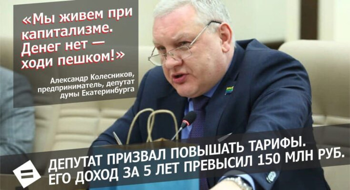 ТЕЛЕГРАММ замедляется.Вероятно скоро его заблокируют.Чтобы не потерять нас и получать оперативно информаци. подпишись на наши каналы в МАХ.Кто еще не подписался В полностью Российской сети МАХ на каналы ВОЕННЫЕ ПЕНСИОНЕРЫ : Канал для Военных пенсионеров без войны и политики:О Военных пенсиях,пенсиях жен военных пенсионеров ,жизни военных пенсионеров,о способах прожить дольше,события и новости в России : https://max.ru/voennyepen За Родину .Мы победим.: Оперативная информация О Спецоперации ,политике на канале: https://max.ru/join/aXh9SdoNhgk2rhy901ENolzCyoGLJhMgpon7E6np9n0 СРОЧНО ПОДПИСЫВАЙСЯ и ты будешь в курсе оперативных событий.НЕ пропусти!!! Депутат из Екатеринбурга призвал неимущих россиян ходить пешком. Его доходы за 5 лет превысили 150 млн рублей. «Мы живем при капитализме. Мы почему не поднимаем стоимость [проезда]? Чего боимся? Не нравится, денег нет – не езди, ходи пешком!» – заявил предприниматель и депутат Городской думы Екатеринбурга Александр Колесников, призвав повышать тарифы на проезд в общественном транспорте. Заседает в думе он с 2018 г., когда был избран от «Справедливой России», а в нынешнем созыве представляет «Единую Россию». В думе VII созыва он был председателем Комиссии по городскому хозяйству, градостроительству и землепользованию. «У нас бюджет социальный, но скоро будет не в чем жить. Нам нужно больше закладывать на ЖКХ», – говорил депутат. С его законотворческой деятельностью тесно связано личное участие в бизнесе. С 2015 г. Колесников руководит ООО «УК «РЭМП Железнодорожного района» (владельцы – Максим Дорожкин и Евгений Новиков). Компания занимается управлением и ремонтом многоквартирных домов в Екатеринбурге, предоставляет коммунальные услуги. Также она участвует в городских программах «Формирование современной городской среды на 2018–2024 гг.» и «Развитие ЖКХ, повышение энергетической эффективности на 2017–2020 гг.». Выручка РЭМП в 2022 г. составила 2,4 млрд руб., а чистая прибыль – 65 млн руб. К компании были многочисленные претензии со стороны надзорных органов. На Яндексе и Google немало красноречивых отзывов от «благодарных» екатеринбуржцев. Во 2-м квартале 2023 г. средний доход в Свердловской области был 44 640 руб. чистыми. По сравнению с тем же периодом 2015 г., номинально он вырос на 48%. Тарифы на услуги ЖКХ в Екатеринбурге за этот период выросли в 1,6–2,1 раза, по данным Росстата: горячая вода – на 108% водоотведение – на 106% электроэнергия – на 68% отопление – на 62% холодная вода – на 42% Но претензии горожан по поводу постоянного роста тарифов и наплевательского отношения откровенно раздражают Колесникова: «Жители говорят: «Мы очень много платим». Приносят квитанцию на 10 000 руб. Объясняю: из этой десятки ты платишь 8000 не мне, а ресурсоснабжающим организациям. Оплата проходит через меня, но я получаю всего 2000», – написал он на E1.ru. Уместен вопрос: получает за что? «Достаточно короткого общения с УК при попытке решить хоть какие-то вопросы, как ты вдруг узнаешь, что обязанность платить у тебя есть, а прав нет», – разнес колонку депутата бывший главный энергетик города Андрей Щербинин. Самому же Колесникову при капитализме живется действительно неплохо. По декларации о доходах за 2021 г., он получил 31 млн руб. Это 7-е место среди депутатов гордумы. На 1-м месте Дмитрий Николаев, отчитавшийся о 70 млн руб. Иными словами, в 2021 г. Колесников получал по 2,6 млн руб. в месяц, чт