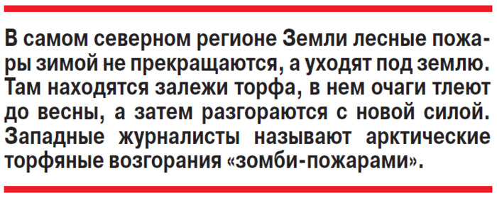 Ученые не исключают возникновения нынешней весной массовых лесных пожаров на севере страны. Виновником они называют… огонь, круглый год тлеющий под землей. Журналисты успели прозвать их «зомби-пожары». Этот феномен обнаружили американские ученые: просматривая спутниковые снимки, сделанные над самым северным регионом Земли, они заметили странные очаги тепла. Понадобилось несколько лет, чтобы понять: лесные пожары зимой в Арктике не прекращаются, а уходят под землю. Там находятся залежи торфа, в нем очаги тлеют до весны, а затем разгораются с новой силой. Ученые создали высокоточную карту залегания торфяников в Северном полушарии. Оказалось, что здесь их находится около 7 млн квадратных километров, из которых 1,8 млн «квадратов» расположены на многолетней мерзлоте. В Центральной и Восточной Сибири таких участков мало - около 1 млн квадратных километров, да и назвать их крупными довольно сложно. Но при этом проблем они создают немало. Для таких мест характерна нехватка кислорода, поэтому там остатки болотных растений не разлагаются окончательно, а в течение многих столетий накапливаются в виде однородной бурой массы - торфа. Важнейшей особенностью торфяных пожаров является то, что они разгораются и распространяются очень медленно, но продолжаются долго - в течение многих месяцев, а иногда даже нескольких лет. При этом торф не горит открытым огнем - он тлеет. Этот процесс продолжается даже зимой, поскольку очаги тления оказываются прикрытыми от холода слоями золы, лежащей сверху. Недавно появилось видео из якутского поселка Оймякон, известного как самое холодное место в мире. Минус 60 градусов Цельсия зимой здесь - нормальное явление. На записи видно, что даже при такой критической температуре из-под снега поднимаются столбы дыма. Глава Якутии Айсен Николаев отметил, что подобное случается и в других районах республики. Весной, обычно через полтора-два месяца после схода снега, происходит вспышка. Одной из главных причин возгораний в таежных районах специалисты считают удары молний. Совершенно точно, что лесные пожары в Якутии - последствия гроз, особенно опасных в засуху. К слову, молний в Арктике все больше: если в 2010-м их было около 35 000, то уже в 2020-м - 240 000. Это связывают с потеплением климата. Подземный огонь часто выжигает корневую систему и почву под деревьями, те погибают и ближе к лету падают. Климатические условия привели к тому, что торфяников в Арктике становится все больше. Холод, переувлажнение и кислая реакция среды подавляют работу бактерий, препятствуют эффективному разложению мертвой растительности, а это, в свою очередь, создает мощные залежи торфа. Специалисты утверждают, что подземные пожары неизбежно будут мигрировать, захватывая собой соседние районы, и не исключено, что дойдут до Сибири. В труднопроходимой тайге добраться до очагов возгорания по земле спасателям практически невозможно. При этом торфяники нельзя тушить с помощью авиации: когда падающая с большой высоты вода ударяется о почву, в воздух вылетает горящая торфяная крошка, что приводит только к усилению пожара. В МЧС проводили эксперимент, во время которого использовали самолет Ил-76, способный выбросить на участок тонны воды. Результаты оказались неутешительными: глубина промачивания почвы составляет всего 5-7 см. А глубина залегания торфа - о