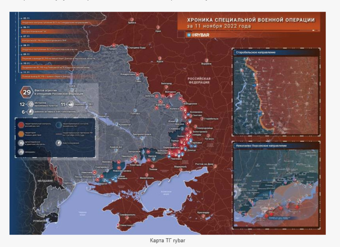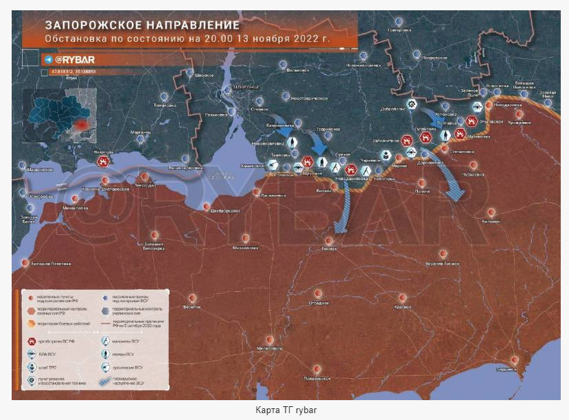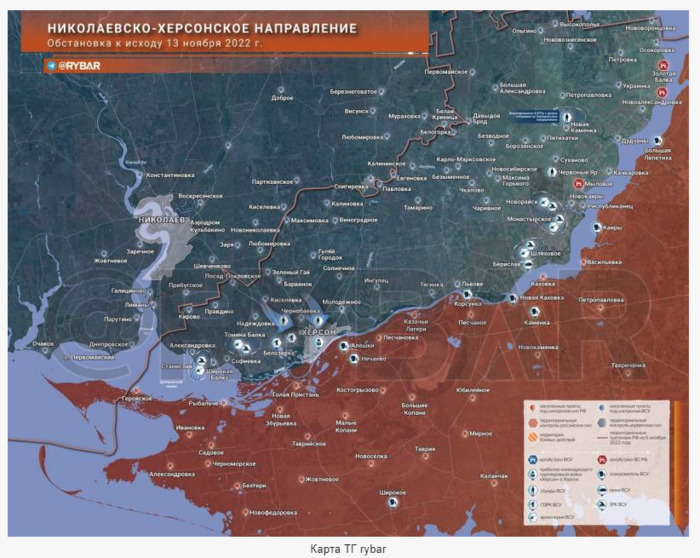 Чтобы понять и рискнуть предсказать, что у нас в жизни будет дальше, какие судьбоносные решения и повороты нам предначертаны, мы со Ставером довольно долго сидели над картой. Карта – она позволяет долго думать и порой приходить к неожиданным решениям. Вот карта района, к которому прикованы все взгляды и долго еще на этот участок земной поверхности будут смотреть сотни тысяч глаз. С разными чувствами. Карта ТГ rybar Нашей задачей стала попытка понять, как могут дальше развиваться события в этой части Украины и России. Итак, что мы имеем сегодня: 1. Херсон оставлен, судя по всему, будет оставлена и Новая Каховка, линия обороны пройдет где-то в 5 км от береговой линии Днепра. Это, с одной стороны, весьма обосновано, потому что согласно законам природы в этом мире, левый берег Днепра категорически ровный и низкий. В отличие от правого берега. Соответственно, с правого берега обстреливать левый будет очень просто, а вот в ответ… Впрочем, здесь совершенное повторение происходившего 80 лет назад, так что заново обсуждать это смысла мы не видим. Отвод российских войск от береговой линии связан с тем, что теперь в любой момент украинцы могут обрушить на левый берег всю мощь воды, накопленной в Каховском водохранилище. Акция одноразовая, не способная принести ощутимого результата, но с ней придется считаться, потому что то, что украинцы смогут подорвать плотину, в этом мы совсем не сомневаемся. Могут подорвать, и подорвут. Потому, как это ни прискорбно, но прибрежная линия останется пустой и российская армия будет держать оборону на безопасном расстоянии. Тем самым создается определенная возможность для формирования Днепра (особенно в зимнее время) диверсионными группами, которые будут тревожить линию обороны российских войск и держать в напряжении. То, что украинцы прекрасно научились использовать высокомобильные ДРГ на легкобронированной технике, надеюсь, никто спорить не станет. Параллельно стоит отметить, что подрыв плотины Каховского водохранилища одновременно с затоплением нижних территорий создаст еще две проблемы. Первая – это обезвоживание Крымского канала, которое снова создаст напряженную водную обстановку на полуострове. Впрочем, это не самая главная проблема в Крыму. Вторая – это оставление без воды охладительной системы Запорожской АЭС. Это тоже не очень большая проблема, потому что реакторы ВВЭР-1000 можно (и нужно по-хорошему) заглушить, а делается это намного проще, чем приснопамятные РБМК. Да, куча городов и сел в Украине останется без электроэнергии, зато не будет так остро стоять проблема аварийной ситуации на АЭС. Карта ТГ rybar 2. Херсон теперь это не узел обороны, это узел для наступления. И, к сожалению, не российский, а украинских войск. Имея за спиной большой город с его инфраструктурой, можно и нужно обеспечить армию всем, что необходимо: ремонт техники, лечение раненых и больных в городских стационарах, отдых частей при ротации. Да, надо отметить, что в ВСУ знают, что это такое - ротация. Обещанного усиления войск в Донецкой и Луганской областях ожидать не стоит. ВСУ просто не позволят это сделать, а если такая перегруппировка вдруг и произойдет, данные об этом незамедлительно окажутся в распоряжении ВСУ благодаря американским спутникам. Соответственно, начнется просто тривиальная попытка наступления в направлении на