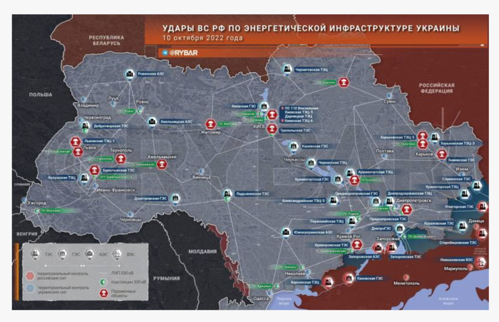 Нанесенные 10 октября удары по энергетической системе Украины затронули не все объекты, на восстановление электроснабжения понадобится всего несколько дней. К такому выводу пришли эксперты, подведя итоги первого дня массированных ударов. По данным ТГ-канала Рыбарь, основные удары ВС России в понедельник нанесли по восточным, центральным и западным областям Украины. Всего были поражены энергетические объекты в 11 городах. Если идти по списку, то в Киеве под удар попали: ТЭЦ-5, ТЭЦ-6, Дарницкая ТЭЦ, подстанция (ПС) Вокзальная 110 кВ, Трипольская ТЭС. В Житомире - ПС Житомир 330/110 кВ, Хмельницкий: ПС Хмельницкая 330/110 кВ, Тернополь: ПС Тернополь 330/110/35 кВ, Львов: Львовская ТЭЦ-1, ПС Львов-Южная 330/220/110 кВ, Ивано-Франковск: Бурштынская ТЭС, Сумы: ПС Конотоп 330 кВ, Полтава: ПС Кременчуг 330/154/35/10 кВ. Днепропетровск: Приднепровская ТЭС, Кривой Рог: Криворожская ТЭС, в Харькове - ТЭЦ-5, Змиевская ТЭС, ПС Залютино 330/110/35 кВ. Таким образом, основными целями ракетных ударов стали ТЭС и подстанции с уровнем напряжения 330кВ. Ни одного удара не было нанесено по подстанциям напряжения 750кВ, а также атомным и гидроэлектростанциям. Кстати, последнее в Киеве записали себе в заслуги, заявив, что удары по атомным станциям якобы наносились, но украинская ПВО сбила все ракеты. По мнению команды Рыбаря, в понедельник ВС России продемонстрировали уязвимость энергосистемы Украины и то, что еще одного удара она точно не переживет, превратившись из единой системы в раздельную с электричеством в отдельных районах страны. Если же удар останется единичным, то на восстановление энергоснабжения понадобится не более нескольких дней, после чего Киев объявит об очередной перемоге над Россией. Между тем российские ВС продолжили наносить удары по энергосистеме Украины, выводя из строя новые ТЭС и подстанции. Сегодня с утра воздушная тревога объявлена на территории всех областей страны. Пока о результатах нового удара говорить рано, обобщение будет готово к вечеру, скорей всего. Но про одну ТЭС уже можно сказать, в Винницкой области дроны-камикадзе ударили по Ладыженской ТЭС, выведя ее из строя. | |