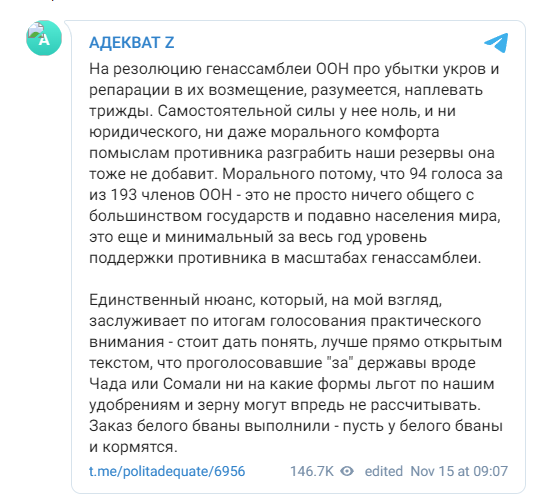 Об этом во вторник заявил пресс-секретарь президента России Дмитрий Песков. Так он прокомментировал резолюцию Канады, Гватемалы, Нидерландов и Украины, которая была принята большинством голосов (94) на Генассамблее ООН. Против выступили 14 стран, включая Москву. Документ призывает начать выплату компенсаций Украине за "агрессию со стороны России". Причём он предусматривает возможность выплаты за счёт русских резервов, которые ранее незаконно арестовали США и Евросоюз. Песков отметил, что западные страны фактически используют площадку ООН, чтобы легализовать грабёж. Организаторы этого процесса пытаются завершить грабёж наших резервов, которые были незаконным образом заблокированы. Это формализация этого грабежа с использованием площадки ООН, - пояснил он. Официальный представитель Кремля добавил, что резолюция не является юридически обязывающим документом, поэтому Россия так и будет к нему относиться. Аналогичную точку зрения озвучил политолог Евгений Михайлов. В разговоре с каналом 360 он отметил, что результаты голосования подтвердили потерю субъектности ООН. Сегодня данная организация существует только для того, чтобы отстаивать интересы США. Резолюция говорит, что эта организация полностью потеряла свою субъектность и стала объектом влияния американцев и их союзников. Сама она не имеет юридической силы. Её имеют только решения Совета Безопасности, где Россия имеет право вето, - подчеркнул эксперт. Автор Telegram-канала "Адекват" в свою очередь призвал Россию отреагировать на участие некоторых стран в голосовании за резолюцию. Он обратил внимание, что к демаршу против России присоединились Чад и Сомали. И теперь, утверждает блогер, эти государства должны быть лишены льгот на закупку русских удобрений и зерна. Заказ белого бваны (хозяина - ред.) выполнили - пусть у белого бваны и кормятся, - заключает автор канала. Стоит также отметить, что ООН принимает исключительно однонаправленные резолюции. Он голосует за компенсацию для Украины, хотя именно Запад спровоцировал данный конфликт расширением НАТО. И при этом голосует против расследования американских биолабораторий на Украине, которые, по некоторым данным, заняты разработкой биологического оружия. | |