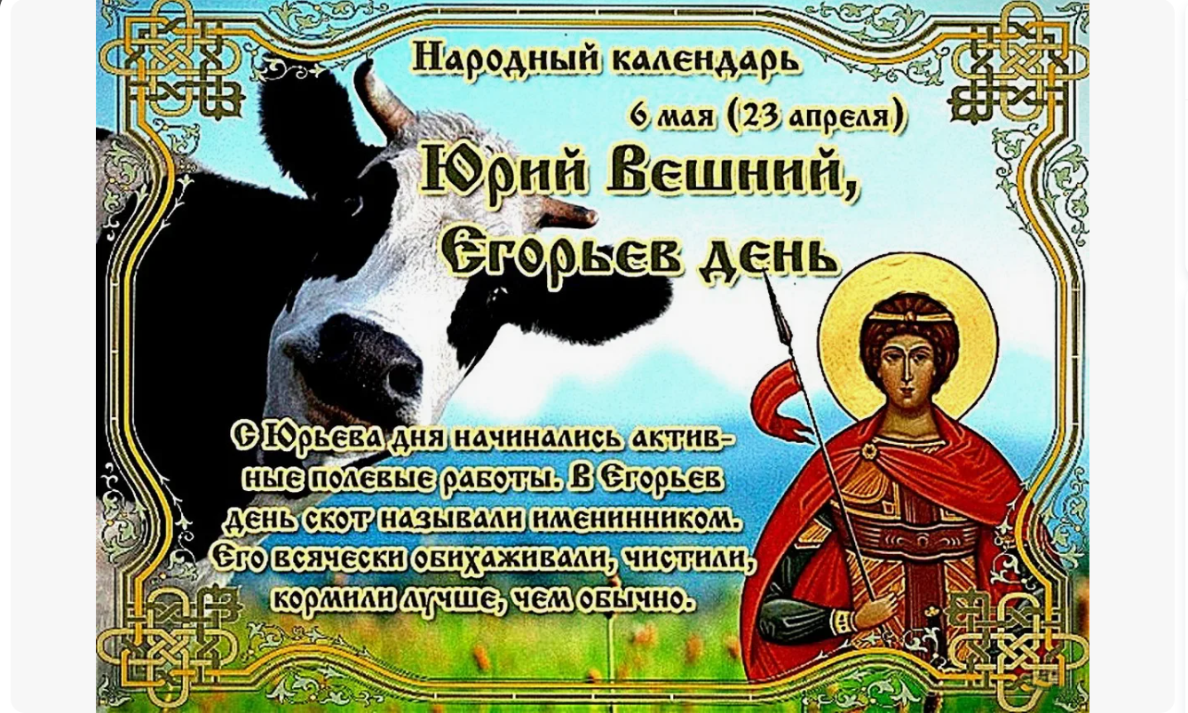 Народный праздник Егорий Вешний, он же Юрьев день, отмечается 6 мая 2025 года (по старому стилю – 23 апреля). В православном церковном календаре это дата памяти праведника и великого мученика Георгия Победоносца – одного из самых почитаемых святых у славян. Имя Георгий не является русским, поэтому народ использовал его производные – Егорий и Юрий.