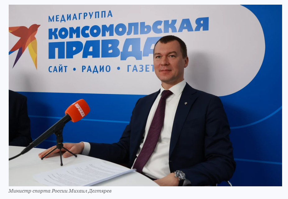 Гостем открытой студии медиагруппы «Комсомольская правда» стал новый Министр спорта России Михаил Дегтярев. Это его первое интервью с момента назначения на должность руководителя отечественного спорта после поста губернатора Хабаровского края Павел САДКОВ