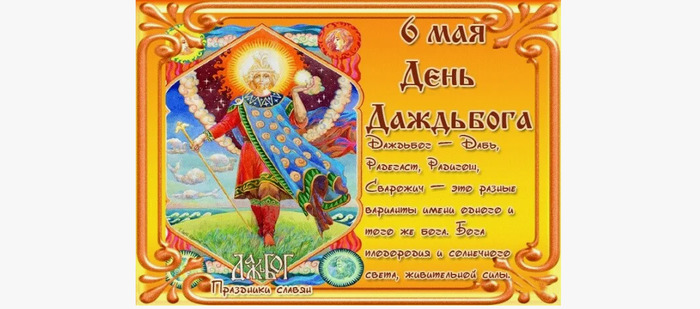 ТЕЛЕГРАММ замедляется.Вероятно скоро его заблокируют.Чтобы не потерять нас и получать оперативно информаци. подпишись на наши каналы в МАХ.Кто еще не подписался В полностью Российской сети МАХ на каналы ВОЕННЫЕ ПЕНСИОНЕРЫ ЗА РОССИЮ И ЕЕ ВООРУЖЕННЫЕ СИЛЫ: Канал для Военных пенсионерах без войны и политики, Военных пенсиях,пенсиях жен военных пенсионеров ,жизни военных пенсионеров и о способах прожить дольше : https://max.ru/voennyepen За Родину .Мы победим.: Оперативная информация О Спецоперации ,политике на канале: https://max.ru/join/aXh9SdoNhgk2rhy901ENolzCyoGLJhMgpon7E6np9n0 СРОЧНО ПОДПИСЫВАЙСЯ и ты будешь в курсе оперативных событий.НЕ пропусти!!! В Телеграмм создана группа " Военные пенсионеры за Россию и ее ВС. Мы победим". У кого есть Телеграмм просим вступить в нее. Там много интересного, срочного, очень оперативная информация, а также чего нельзя помещать в ОДНОКЛАССНИКАХ и на сайте. Вступить можно по ссылке: Военные пенсионеры за Россию и ее ВС. Мы победим "https://t.me/voenpenszaRossiu" Очень большая просьба НЕ ОТПИСЫВАТЬСЯ ОТ КАНАЛА, Канал работает в тестовом режиме. Мы стараемся понять, что Вам будет интересно читать и как работать дальше. Пишите, что бы Вам хотелось читать в ТЕЛЕГРАММ. Хоть в любой теме на сайте, хоть в Телеграмм. Чтобы не раздражали уведомления их можно ОТКЛЮЧИТЬ. Кого раздражают уведомления в Телеграмм их можно отключить. Отключить уведомления можно нажав на надпись ОТКЛЮЧИТЬ УВЕДОМЛЕНИЯ внизу Дата в 2025 году: 6 мая , вторник Другие названия: Овсень большой; Встреча весны Значение: Языческий праздник в честь Даждьбога – бога плодородия, живительной силы и солнечного света Традиции: Хороводы вокруг костров с песнями, которые прославляют Даждьбога и Живу; выгон скота на пастбища День Даждьбога отмечается 6 мая 2025 года. Это древнеславянский языческий праздник в честь бога плодородия, живительной силы и солнечного света. В этот же день почитают Ярила – бога солнца и Ария –сына Даждьбога. Этих двух персонажей древних легенд часто сравнивают друг с другом и с Даждьбогом. Есть версии, что это лики одного бога. История Даждьбог – один из трех верховных богов в мифологии славянских народов. Его имя дословно означает «дающий благосостояние». Он имеет множество других имен. Самые известные из них – Радигош, Сварожич, Дажьбог. Его считают прародителем славянского народа. Это мнение сформировалось благодаря «Слову о полку Игоревом», в котором есть упоминание о «Даждьбожиих внуках». Легенда гласит, что Даждьбог и Жива обоюдными усилиями восстановили землю после Всемирного потопа. После этого события мать Живы, Лада, отдала дочь в жены Даждьбогу. В скором времени у них появился сын Арий, который дал начало многим славянским народам – чехам, хорватам и др. С тех пор ежегодно супруги пробуждают мир от зимнего холода и дарят весеннее тепло и новую жизнь. Традиции и обряды В день праздника вспоминают, как Даждьбог отказался от любви Марены – богини, которая олицетворяет смерть, и выбрал Живу – богиню жизни и плодородия. Это означает приход весны и возрождение новой жизни. Радость скорого тепла наполняет людские сердца. В этот день почитают соловья – предвестника весны. В народе верят, что эта птичка послана самим Даждьбогом для того, чтобы одним крылом отомкнуть весну и лето, а другим закрыть зиму и холод. Также почитают кукушку. Жена Даждьбога Жива может оборачиватьс