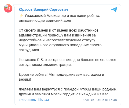 Глава местного самоуправления города Кулебаки Нижегородской области Валерий Юрасов заявил в среду, что он принял решение уволить начальника отдела культуры администрации Светлану Новикову за то, что та грубила и угрожала бойцу-добровольцу на Украине. Он принёс извинения солдату от лица всех чиновников Кулебак. От своего имени и от имени всех работников администрации приношу вам извинения за недостойное поведение своего сотрудника. Новикова С. В. с сегодняшнего дня больше не является сотрудником администрации, - пишет он в Telegram. Юрасов также заявил, что все госслужащие поддерживают русских солдат и желают, чтобы те поскорее вернулись домой с победой. Напомним, что ранее доброволец Александр Л. раскритиковал в соцсетях снабжение военных. По его словам, солдат держат в неотапливаемых помещениях и не предоставляют провизии. Всю еду добровольцам и мобилизованным приходится покупать самостоятельно. После того Светлана Новикова пригрозила добровольцу увольнением со службы со статусом "дезертир". Разговор закончен, солдат. Я вам всё объяснила. Ещё раз увижу в Сети или фото, буду действовать более жёстко, - написала чиновница в соцсетях. Ранее поступали сообщения о том, что чиновники не могут обеспечить мобилизованных всем необходимым. Самый вопиющий случай произошёл в Омске, где призывникам пришлось спать на улице и греться у костра. Журналист и блогер Юрий Подоляка считает, что за такое кто-то из госслужащих "должен присесть". Источник | |