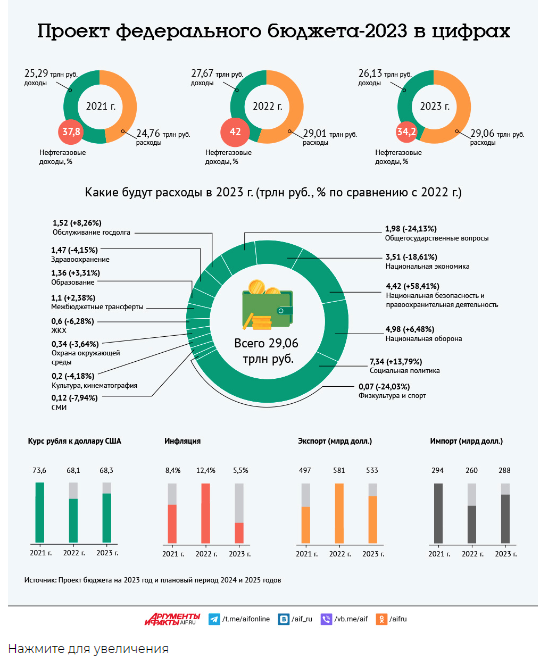 ТЕЛЕГРАММ замедляется.Вероятно скоро его заблокируют.Чтобы не потерять нас и получать оперативно информаци. подпишись на наши каналы в МАХ.Кто еще не подписался В полностью Российской сети МАХ на каналы ВОЕННЫЕ ПЕНСИОНЕРЫ ЗА РОССИЮ И ЕЕ ВООРУЖЕННЫЕ СИЛЫ: Канал для Военных пенсионерах без войны и политики, Военных пенсиях,пенсиях жен военных пенсионеров ,жизни военных пенсионеров и о способах прожить дольше : https://max.ru/voennyepen За Родину .Мы победим.: Оперативная информация О Спецоперации ,политике на канале: https://max.ru/join/aXh9SdoNhgk2rhy901ENolzCyoGLJhMgpon7E6np9n0 СРОЧНО ПОДПИСЫВАЙСЯ и ты будешь в курсе оперативных событий.НЕ пропусти!!! Федеральный бюджет на 2023 год сверстан с дефицитом 2,9 трлн руб., или 2% ВВП, на 2024 год — с дефицитом 1,4% ВВП и на 2025-й — 0,7%. Доходы запланированы в размере 26,13 трлн руб., расходы бюджета — 29,06 трлн руб. С учетом действия санкций и ограничений на движение капитала обменный курс до конца 2022 года будет определяться преимущественно динамикой текущего счета. По итогам 2022 года ожидается, что рубль укрепится 68,1 рублей за доллар США, а в 2023-2025 годах ожидается ослабление курса до 68-72 рублей за доллар США. Проект бюджета предусматривает, что средняя контрактная цена на газ в 2023 году составит $592,2 за тыс. куб. м, а средняя цена нефти марки Urals, которую экспортирует Россия, составит $70,1 за баррель в 2023 году и $67,5 и $65 в 2024–2025 годах соответственно. Снижение ВВП по итогам 2022 года из-за вынужденного разрыва производственных процессов и сокращения внутреннего спроса оценивается на уровне 2,9%. В общем объеме госдолга будет преобладать государственный внутренний долг. Его доля составит 81,6% в 2023 году, 82,4% в 2024 году и 83,5% в 2025 году. По оценкам правительства, цены в 2022 году вырастут в среднем на 12,4%. Ожидается, что инфляция в 2023 году снизится до 5–7% и вернется к 4% в 2024 году. В сфере социального обеспечения населения величина прожиточного минимума в 2023 году на душу населения составит 14 375 рублей, для трудоспособного населения — 15 669 рублей, пенсионеров —12 363 рубля, детей — 13 944 рубля. Какие цифры заложены в проект федерального бюджета на 2023 год, смотрите в инфографике аif.ru. ![]() | |