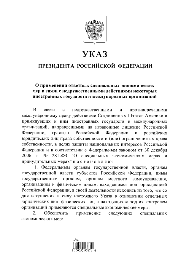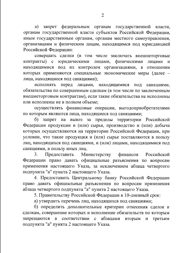 ТЕЛЕГРАММ замедляется.Вероятно скоро его заблокируют.Чтобы не потерять нас и получать оперативно информаци. подпишись на наши каналы в МАХ.Кто еще не подписался В полностью Российской сети МАХ на каналы ВОЕННЫЕ ПЕНСИОНЕРЫ ЗА РОССИЮ И ЕЕ ВООРУЖЕННЫЕ СИЛЫ: Канал для Военных пенсионерах без войны и политики, Военных пенсиях,пенсиях жен военных пенсионеров ,жизни военных пенсионеров и о способах прожить дольше : https://max.ru/voennyepen За Родину .Мы победим.: Оперативная информация О Спецоперации ,политике на канале: https://max.ru/join/aXh9SdoNhgk2rhy901ENolzCyoGLJhMgpon7E6np9n0 СРОЧНО ПОДПИСЫВАЙСЯ и ты будешь в курсе оперативных событий.НЕ пропусти!!! Президент РФ Владимир Путин подписал указ о применении ответных специальных экономических мер в связи с недружественными действиями отдельных иностранных государств и международных организаций. Документ был опубликован во вторник, 3 мая, на официальном портале правовой информации. Указ вступает в силу со дня его официального опубликования и действует до отмены установленных им специальных экономических мер. О каких ответных санкциях идет речь? В указе перечисленные следующие экономические меры: - запрет на совершение сделок (в том числе внешнеторговые контракты) с зарубежными физическими и юридическими лицами, подпавшими под ответные ограничительные меры; - запрет на исполнение обязательств перед зарубежными физическими и юридическими лицами, подпавшими под санкции; - запрет на осуществление финансовых операций, выгодоприобретателями по которым являются лица, находящиеся под санкциями; - запрет на вывоз за пределы территории РФ продукции и сырья, производство и добыча которых осуществляются в России, при условии, что такие продукция и сырье поставляются в пользу лиц, находящихся под санкциями, или лицами, находящимися под санкциями, в пользу иных лиц. Запреты относятся к организациям и физическим лицам, находящимся под юрисдикцией РФ, а также федеральным органам государственной власти, органам государственной власти субъектов РФ, иным государственным органам, органам местного самоуправления. Также в документе говорится, что Министерство финансов РФ и Центробанк получат право давать официальные разъяснения по отдельным вопросам применения указа. Кроме того, в десятидневный срок правительству России предстоит: - утвердить перечень лиц, которые находятся под санкциями; - определить дополнительные критерии отнесения сделок к тем, совершение которых и исполнение обязательств по которым запрещаются в соответствии с новым документом. ![]() | |