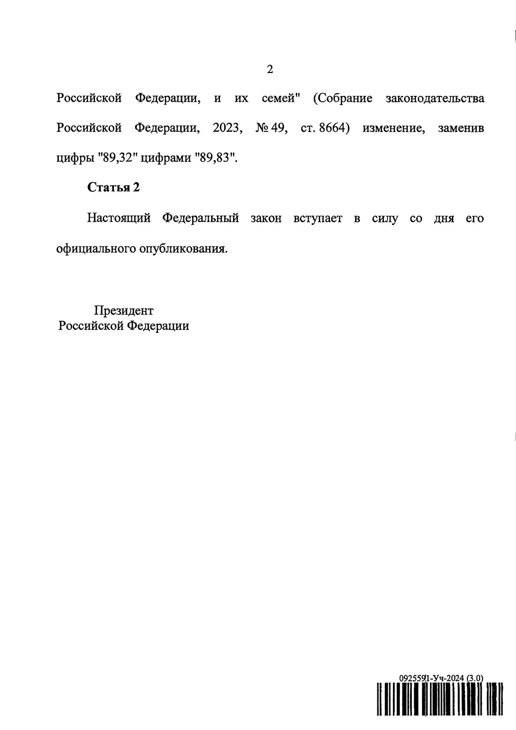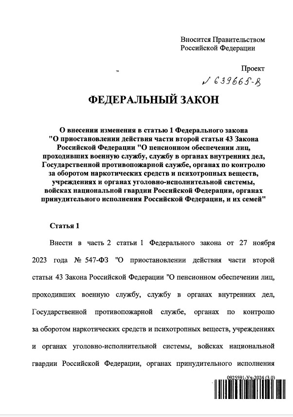 Текст Закона: О внесении изменения в статью 1 Федерального закона "О приостановлении действия части второй статьи 43 Закона Российской Федерации "О пенсионном обеспечении лиц, проходивших военную службу, службу в органах внутренних дел, Государственной противопожарной службе, органах по контролю за оборотом наркотических средств и психотропных веществ, учреждениях и органах уголовно-исполнительной системы, войсках национальной гвардии Российской Федерации, органах принудительного исполнения Российской Федерации, и их семей" (в связи с уточнением отдельных показателей прогноза социально-экономического развития в текущем финансовом году) ПОЯСНИТЕЛЬНАЯ ЗАПИСКА к проекту федерального закона "О внесении изменения в статью 1 Федерального закона "О приостановлении действия части второй статьи 43 Закона Российской Федерации "О пенсионном обеспечении лиц, проходивших военную службу, службу в органах внутренних дел, Государственной противопожарной службе, органах по контролю за оборотом наркотических средств и психотропных веществ, учреждениях и органах уголовно-исполнительной системы, войсках национальной гвардии Российской Федерации, органах принудительного исполнения Российской Федерации, и их семей" В связи с уточнением показателей прогноза социального-экономического развития в текущем финансовом году инфляция (индекс потребительских цен) на конец года составит 5,1 процента. В этой связи проектом федерального закона "О внесении изменения в статью 1 Федерального закона "О приостановлении действия части второй статьи 43 Закона Российской Федерации "О пенсионном обеспечении лиц, проходивших военную службу, службу в органах внутренних дел, Государственной противопожарной службе, органах по контролю за оборотом наркотических средств и психотропных веществ, учреждениях и органах уголовно-исполнительной системы, войсках национальной гвардии Российской Федерации, органах принудительного исполнения Российской Федерации, и их семей" (далее - законопроект) предлагается установить, что размер денежного довольствия, учитываемого при исчислении пенсии в соответствии со статьей 43 Закона Российской Федерации от 12 февраля 1993 г. № 4468-1 "О пенсионном обеспечении лиц, проходивших военную службу, службу в органах внутренних дел, Государственной противопожарной службе, органах по контролю за оборотом наркотических средств и психотропных веществ, учреждениях и органах уголовно-исполнительной системы, войсках национальной гвардии Российской Федерации, органах принудительного исполнения Российской Федерации, и их семей", с 1 октября 2024 г. составляет 89,83 процента от размера указанного денежного довольствия. Законопроектом изменение правового регулирования не предусмотрено, в связи с чем анализ правоприменительной практики не требуется. Положения законопроекта соответствуют положениям Договора о Евразийском экономическом союзе, а также положениям иных международных договоров Российской Федерации. 0925591-Уч-2024 (1.0) Законопроектом требования, которые связаны с осуществлением предпринимательской и иной экономической деятельности и оценка соблюдения которых осуществляется в рамках государственного контроля (надзора), муниципального контроля, привлечения к административной ответственности, предоставления лицензий и ины