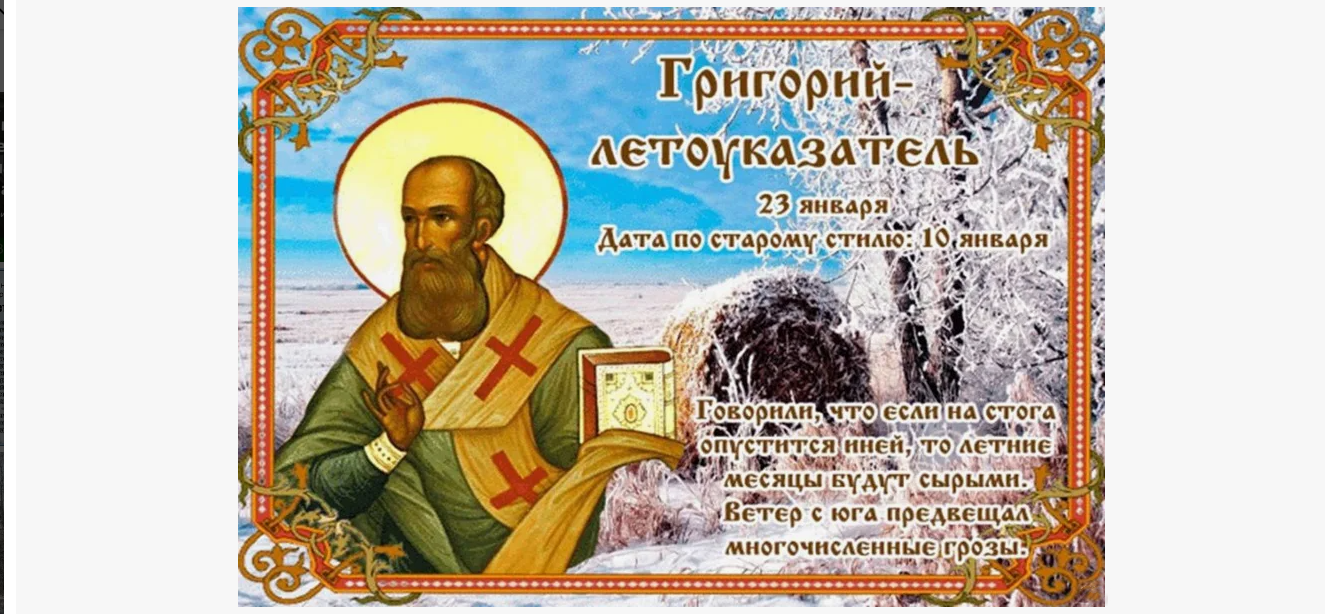 Народный праздник Григорий Летоуказатель отмечается 23 января 2025 года (по старому стилю – 10 января). В церковном православном календаре это дата почтения памяти святителя Григория, епископа Нисского.