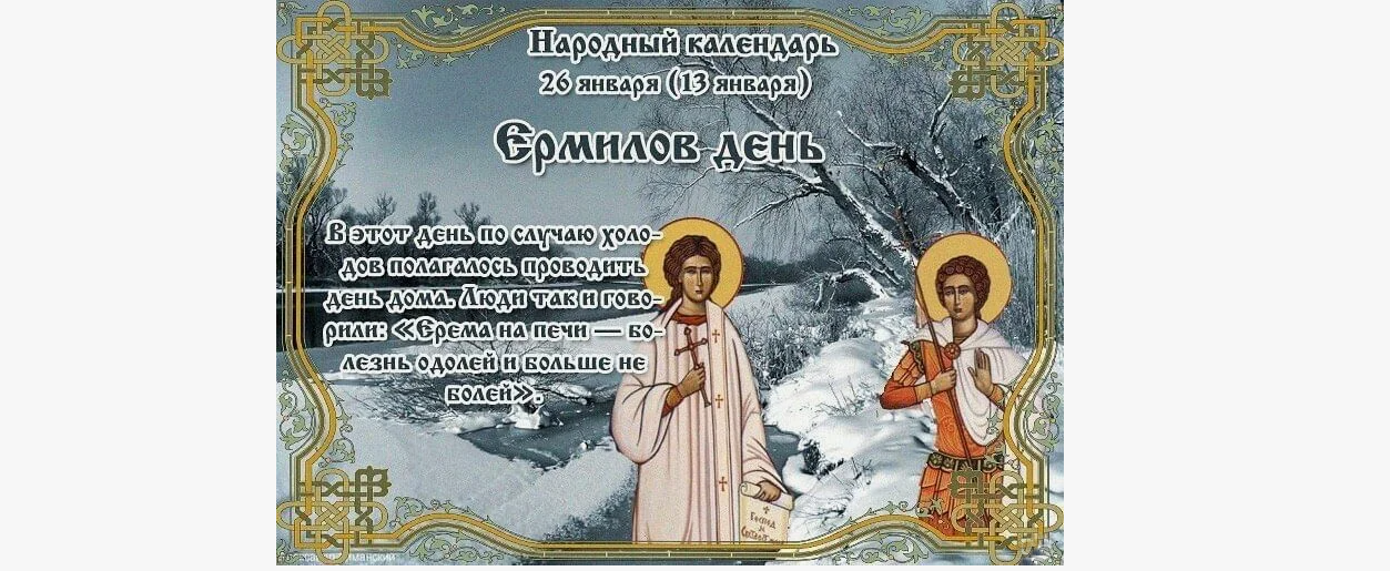 Народный праздник Ермилов день отмечается 26 января 2025 года (по старому стилю – 13 января). В церковном православном календаре это дата почтения памяти мучеников Ермила и Стратоника Синигидонских (Белградских).