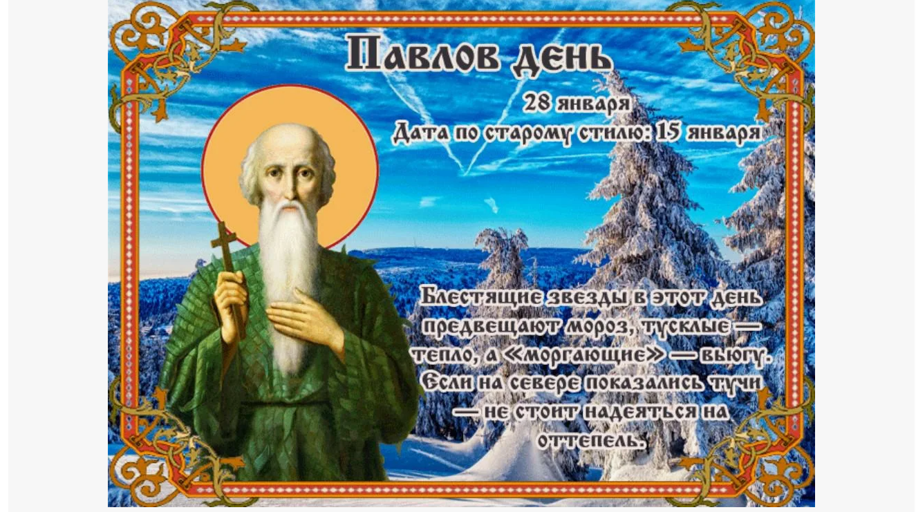 Народный праздник Павлов день отмечается 28 января 2025 года (по старому стилю – 15 января). В церковном православном календаре это дата почтения памяти преподобного Павла Фивейского, первого христианского монаха.