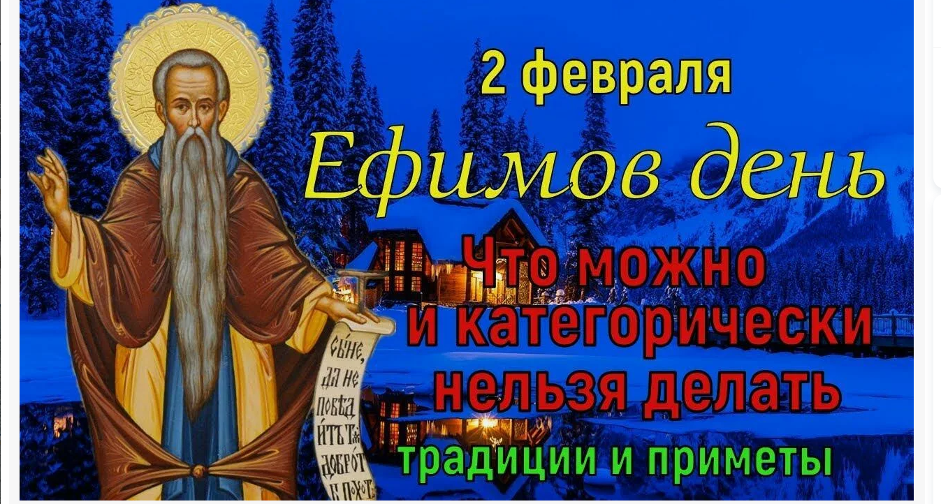 Народный праздник Ефимов день отмечается 2 февраля 2016 года (по старому стилю – 20 января). В церковном календаре это дата почтения памяти иеромонаха Евфимия Великого.