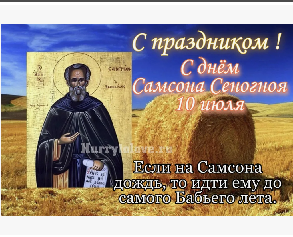 Народный праздник Самсон Сеногной отмечается 10 июля 2024 года (по старому стилю – 27 июня). В православном церковном календаре дата посвящается святому Сампсону Странноприимцу.