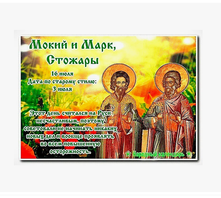 Народный праздник Мокий и Марк, Стожары отмечается 16 июля 2024 года (дата по старому стилю – 3 июля). Православная церковь в этот день чтит память мучеников Мокия и Марка.