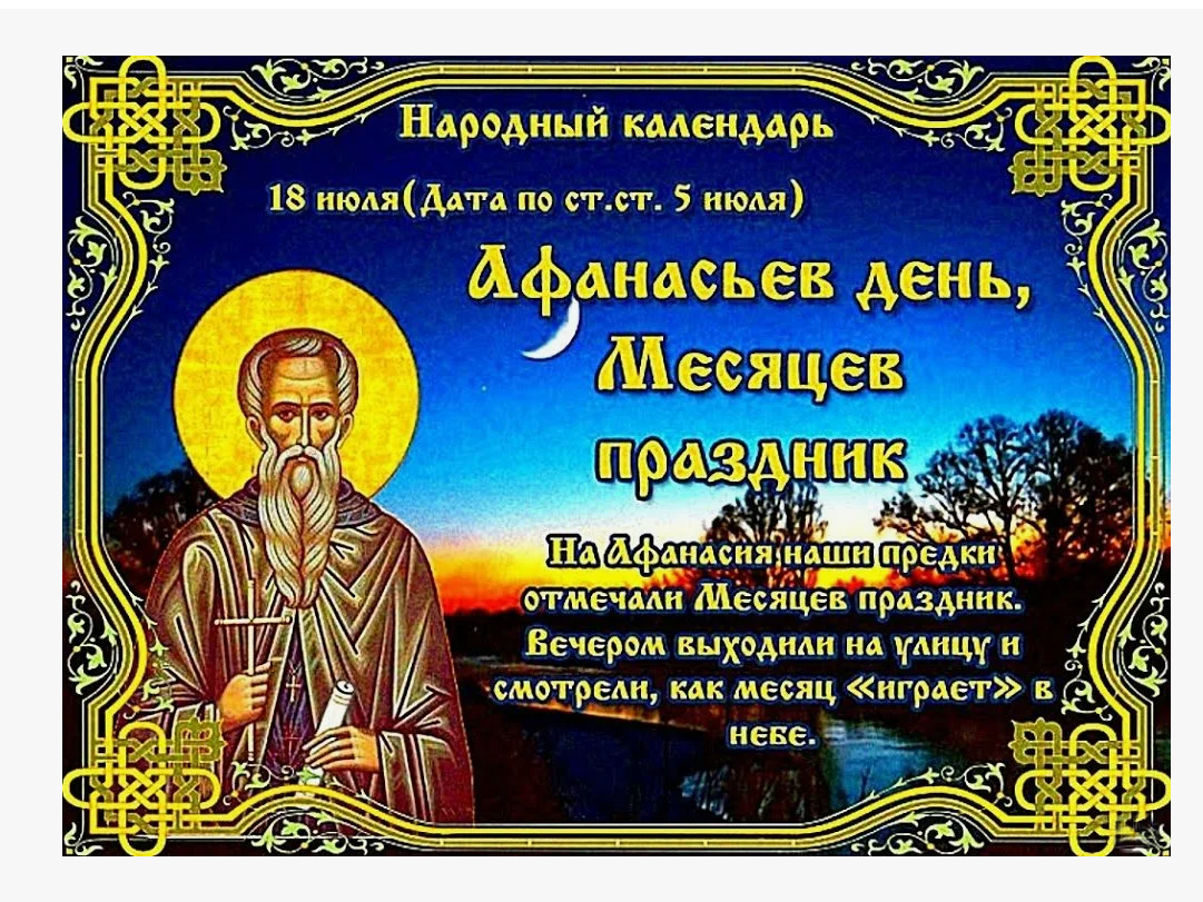 Народный праздник Афанасьев день отмечается 18 июля 2024 года (по старому стилю – 5 июля). По церковному календарю это дата почтения памяти преподобного Афанасия Афонского, игумена.