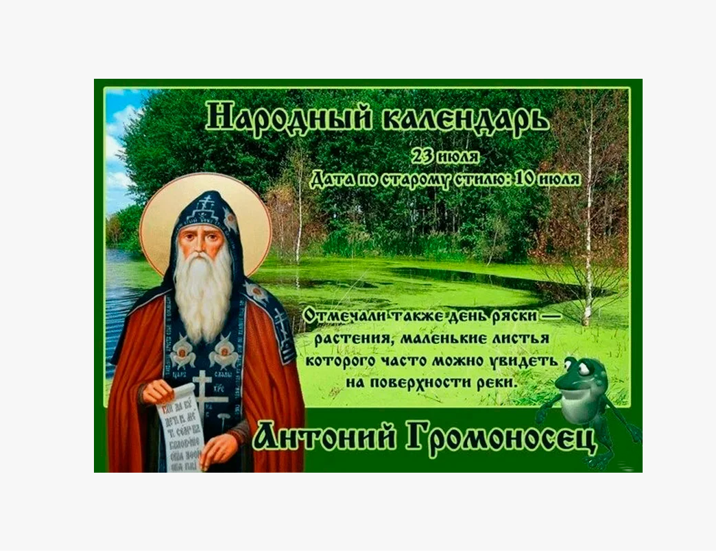 Народный праздник Антоний Громоносец отмечается 23 июля 2024 года (по старому стилю – 10 июля). По церковному календарю это дата почтения памяти преподобного Антония Печерского.
