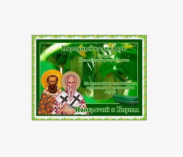 Народный праздник Панкратий и Кирилл отмечается 22 июля 2024 года (дата по старому стилю – 9 июля). В церковном календаре это день почитания двух священномучеников – епископов Панкратия Тавроменийского и Кирилла Гортинского.