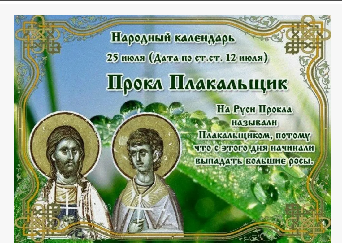 Народный праздник Прокл Плакальщик отмечается 25 июля 2024 года (по старому стилю – 12 июля). В православном церковном календаре это дата почтения памяти мученика Прокла.