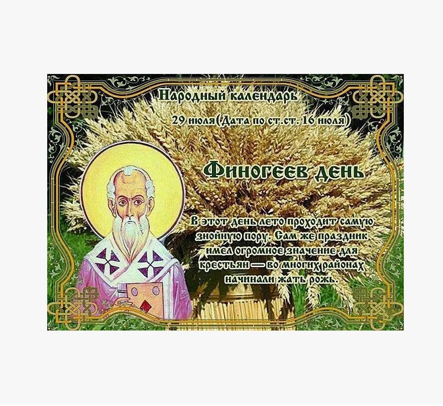 Народный праздник Финогеев день отмечается 29 июля 2024 года (дата по старому стилю – 16 июля). Этого числа по церковному календарю чтут память священномученика Афиногена Пидахфойского, епископа, и его десяти учеников.