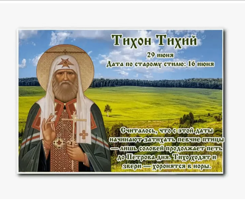 Народный праздник Тихон Тихий отмечается 29 июня 2024 года (по старому стилю – 16 июня). В православном календаре это дата почтения памяти святителя Тихона, епископа Амафунтского.