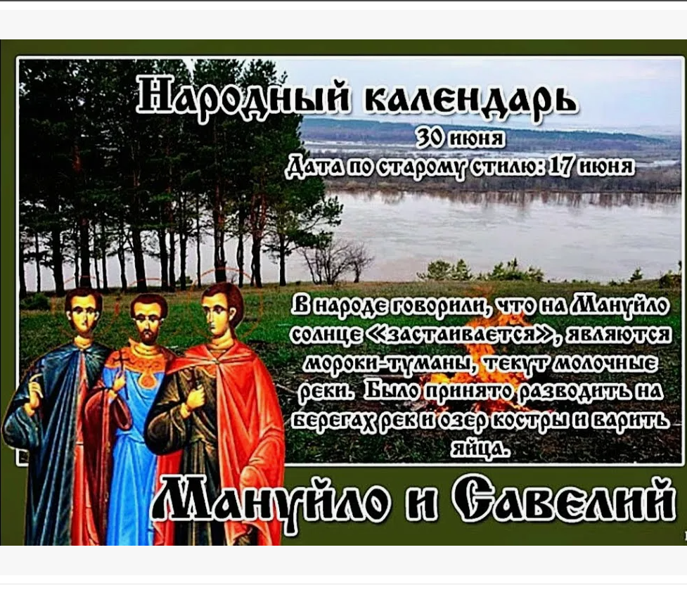 Народный праздник Мануйло и Савелий отмечается 30 июня 2024 года (дата по старому стилю – 17 июня). В этот день православная церковь почитает память трех братьев-мучеников: Мануила, Савела и Исмаила.