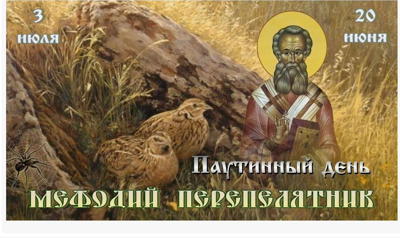 Народный праздник Мефодий Перепелятник отмечается 3 июля 2024 года (по старому стилю – 20 июня). По церковному календарю это дата почтения памяти святого мученика Мефодия Патарского, Олимпийского, епископа.