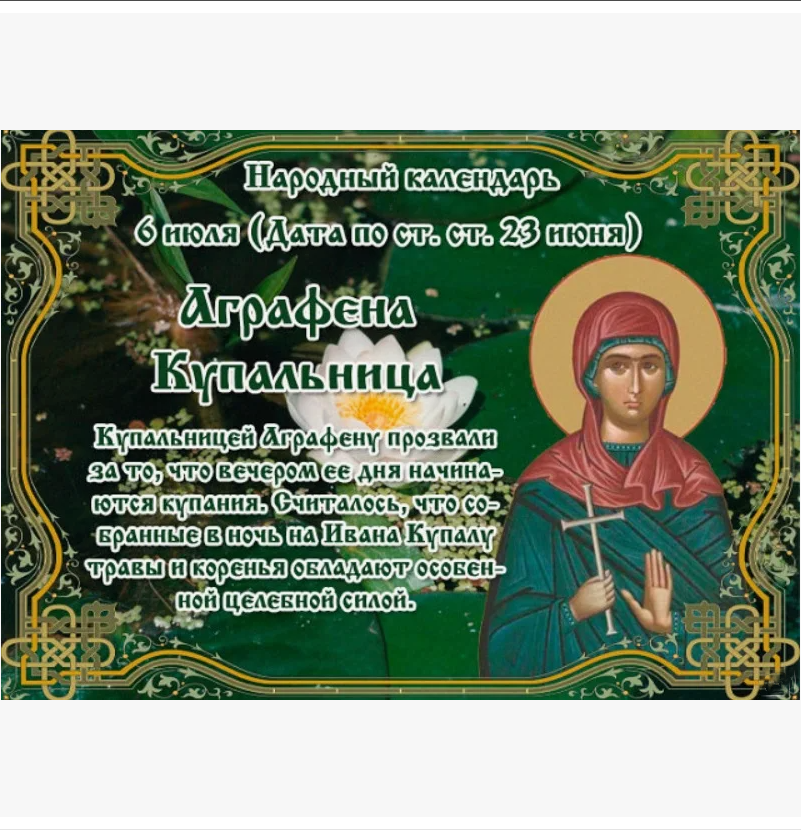 Народный праздник Аграфена Купальница отмечается 6 июля 2024 года (по старому стилю – 23 июня). В православном календаре это дата почтения памяти мученицы Агриппины Римляныни.