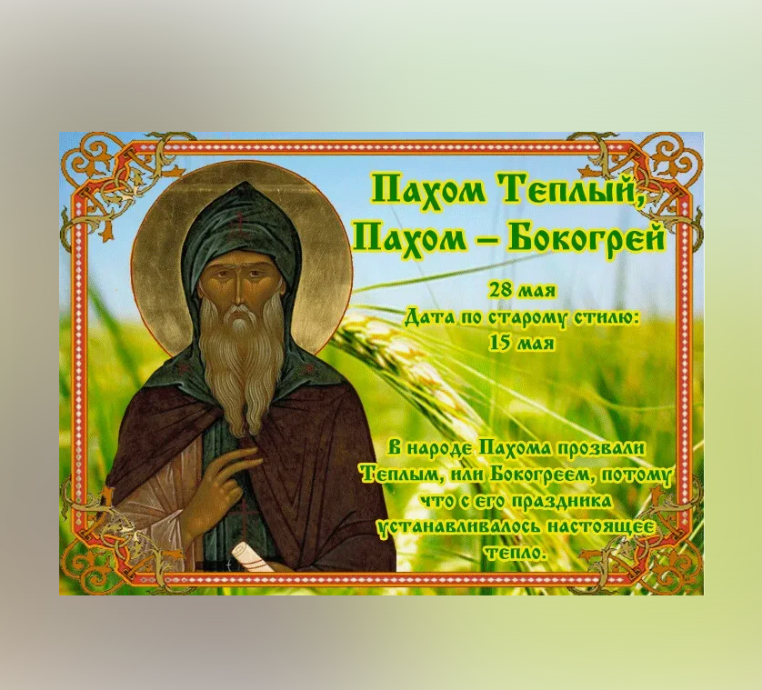 Народный праздник Пахом Теплый отмечается 28 мая 2024 года (дата по старому стилю – 15 мая). Православная церковь в этот день чтит память преподобного Пахомия Великого, Египетского, Фиваидского.