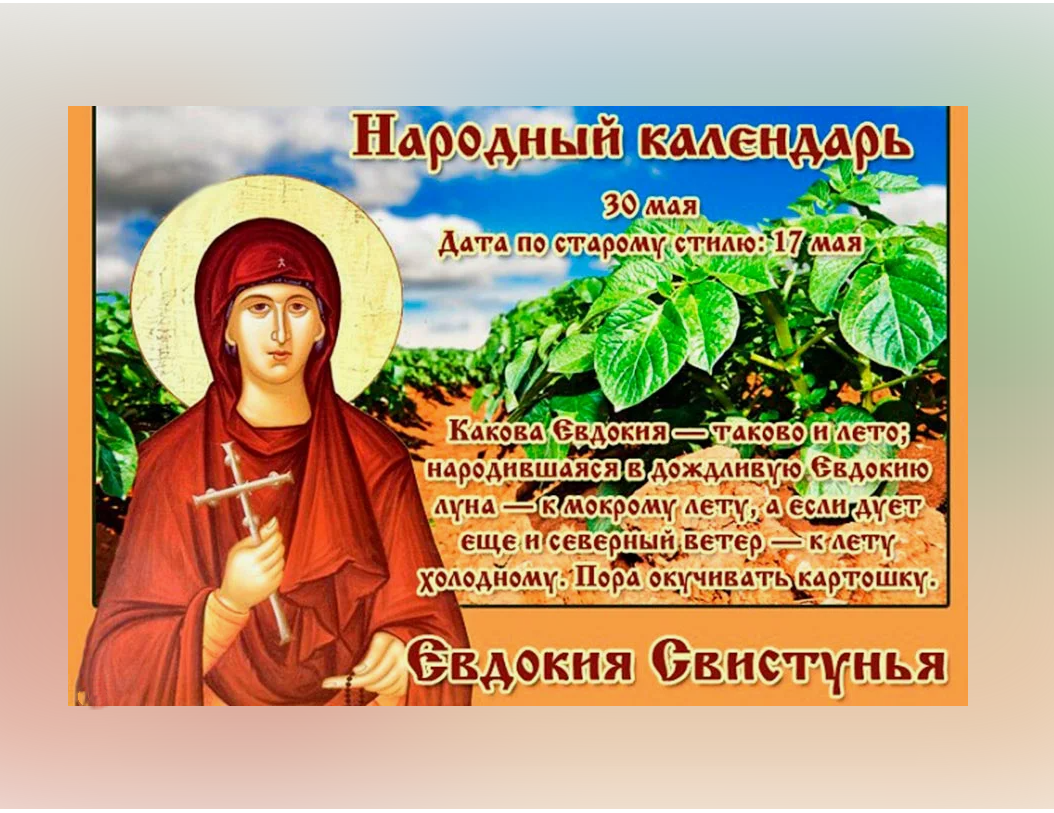 Народный праздник Евдокия Свистунья отмечается 30 мая 2024 года (дата по старому стилю – 17 мая). По церковному календарю в этот день почитается преподобная Евфросиния Московская.