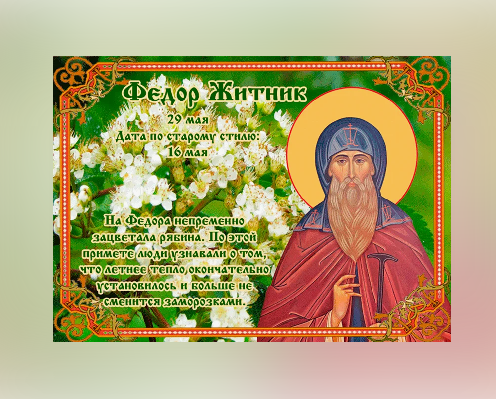 Народный праздник Федор Житник отмечается 29 мая 2024 года (дата по старому стилю – 16 мая). По церковному календарю в этот день почитают преподобного Феодора Освященного, игумена.