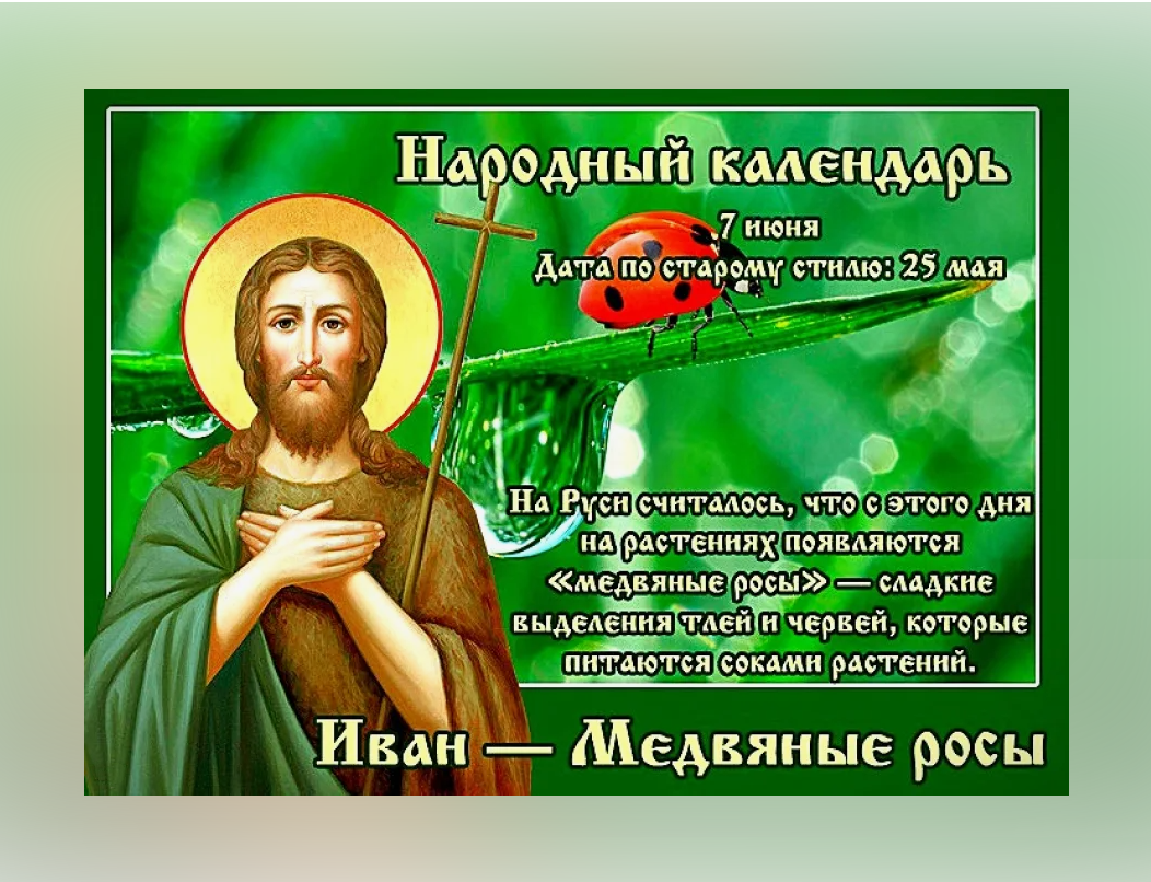 Народный праздник Иван – Медвяные росы отмечается 7 июня 2024 года (дата по старому стилю – 25 мая). Православная Церковь этого числа вспоминает третье обретение главы Пророка, Предтечи и Крестителя Господня Иоанна.