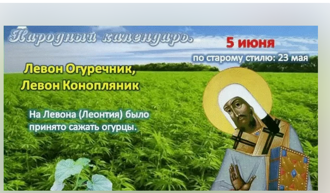 Народный праздник Левон Огуречник (Левон Конопляник) отмечается 5 июня 2024 года (дата по старому стилю – 23 мая). Православная церковь этого числа празднует обретение мощей святителя Леонтия, епископа Ростовского.